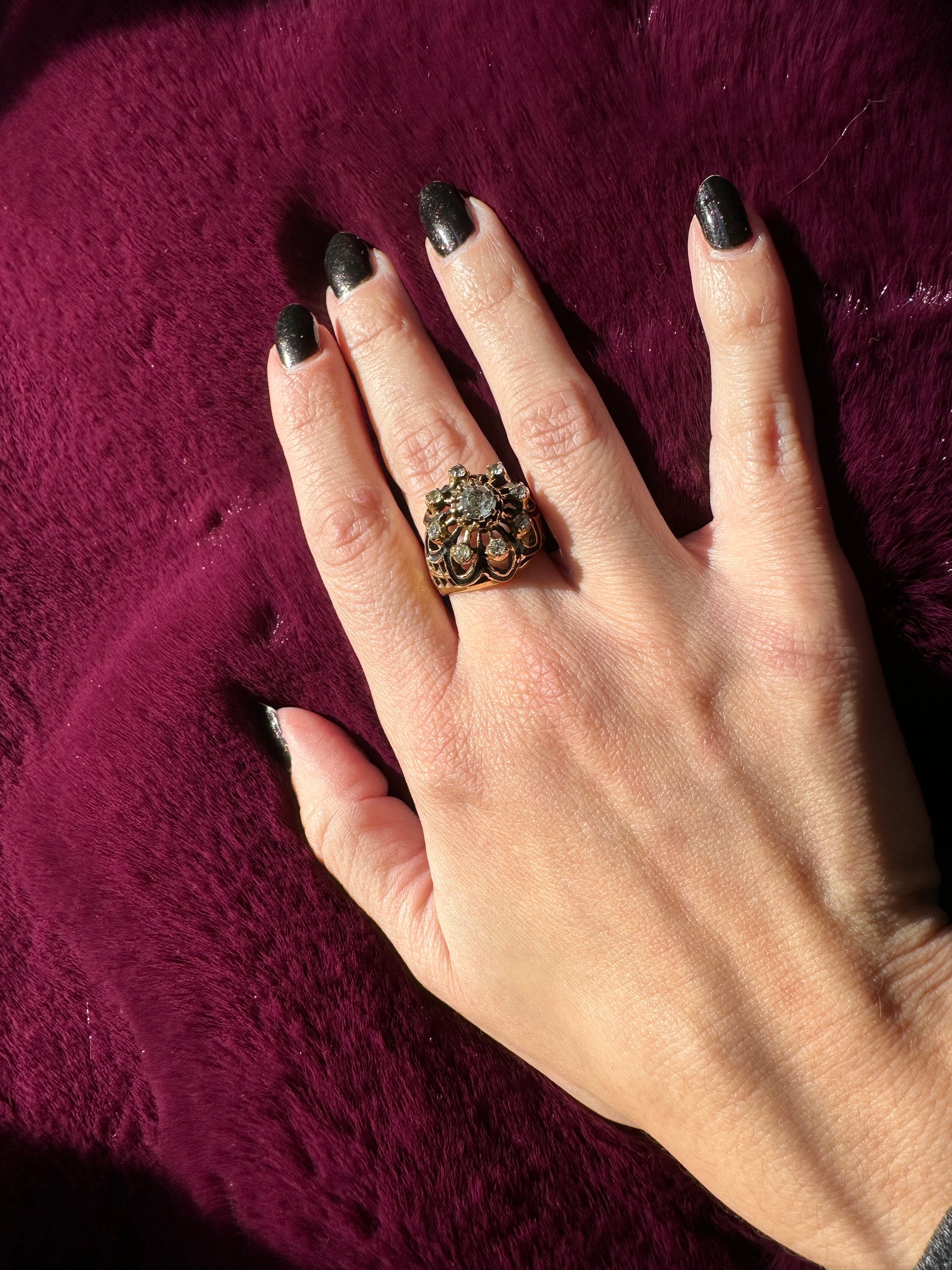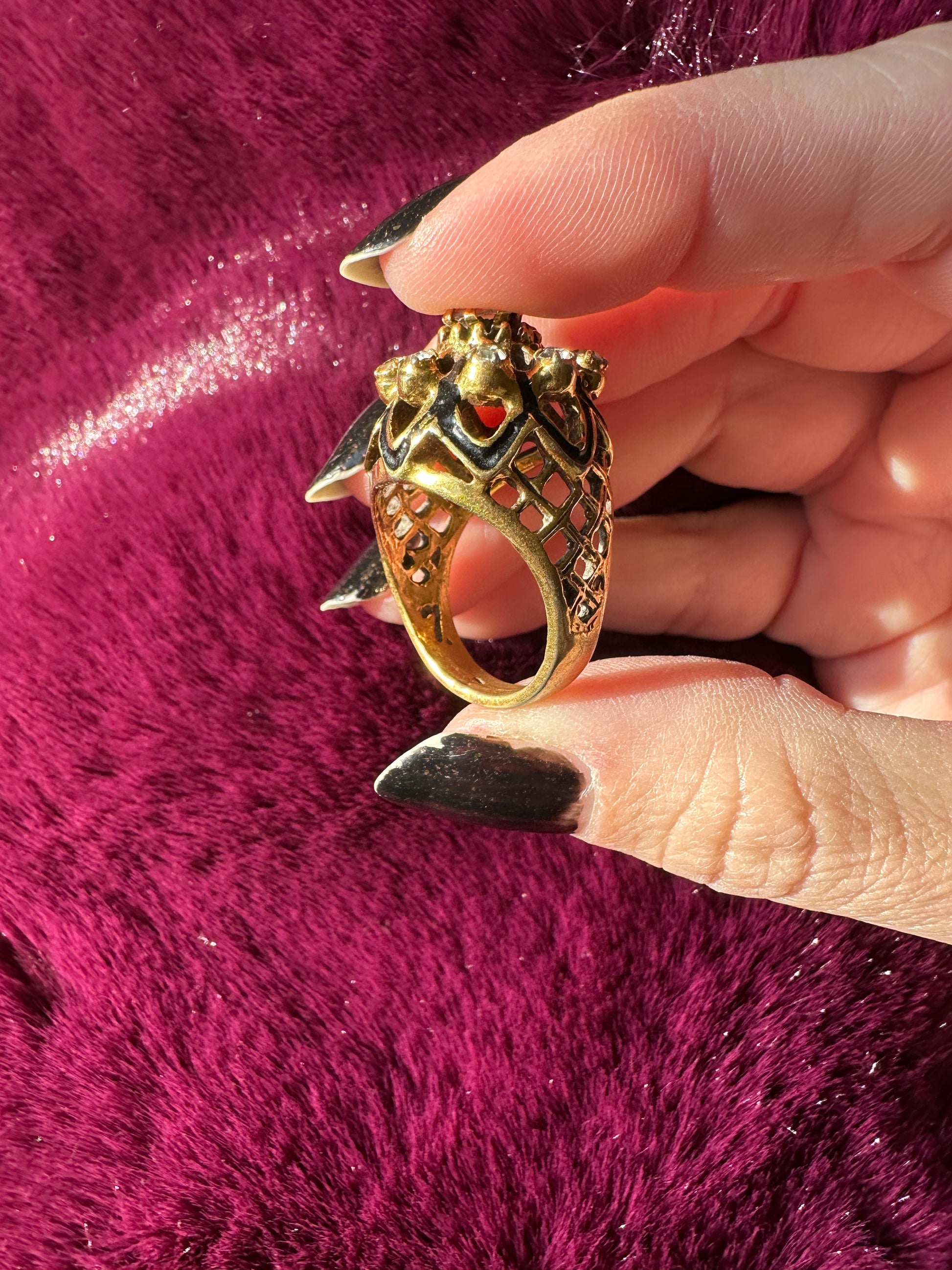 Vintage 50's gold plated cocktail ring. Black enamel on sides and faux diamond rhinestones. Lattice work on sides.
