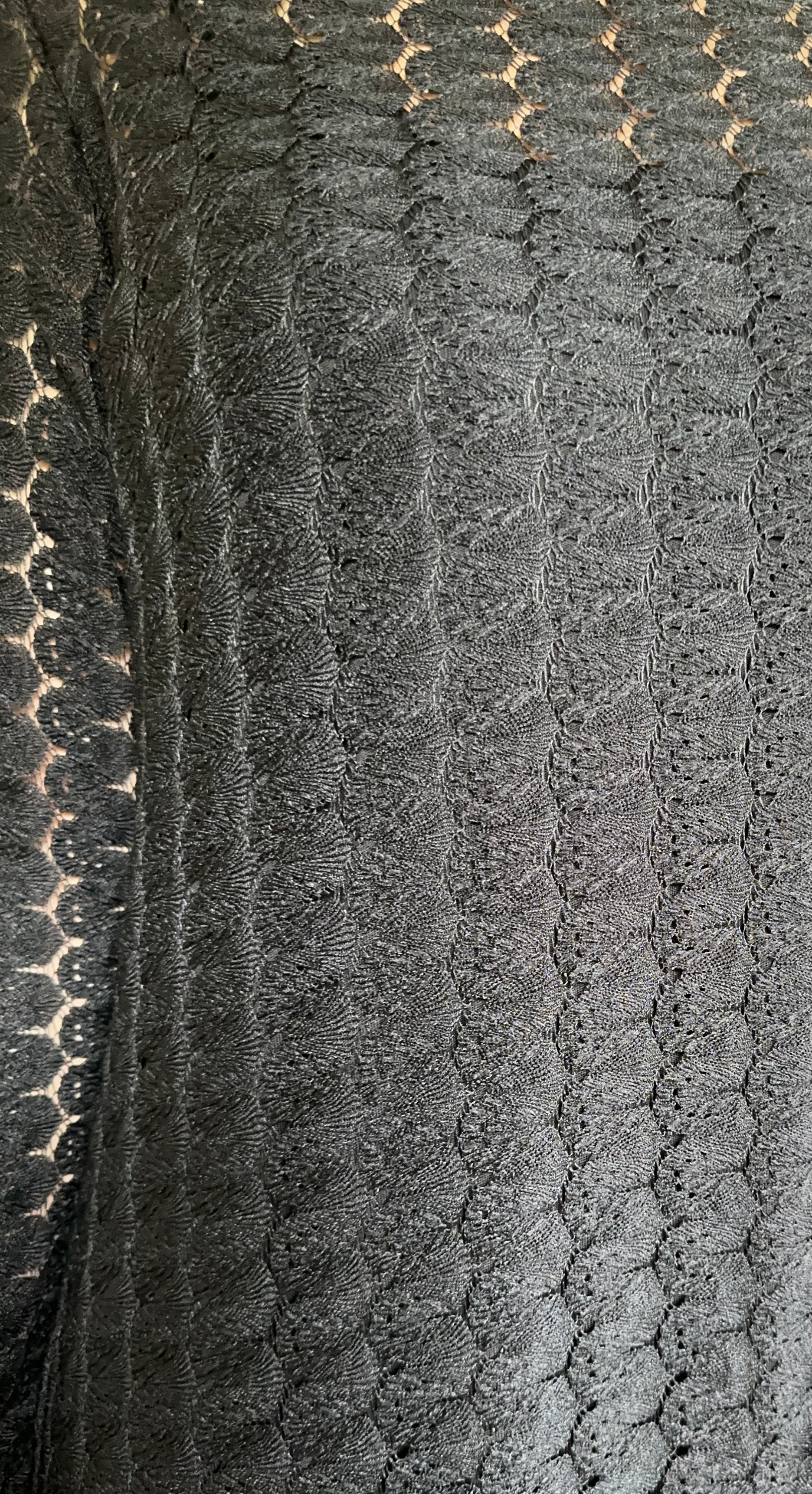 70s black crochet dress with slip. Crew neckline & long sleeves. Back zipper with button closure. 100% Polyester. Some stretch. Pristine condition.