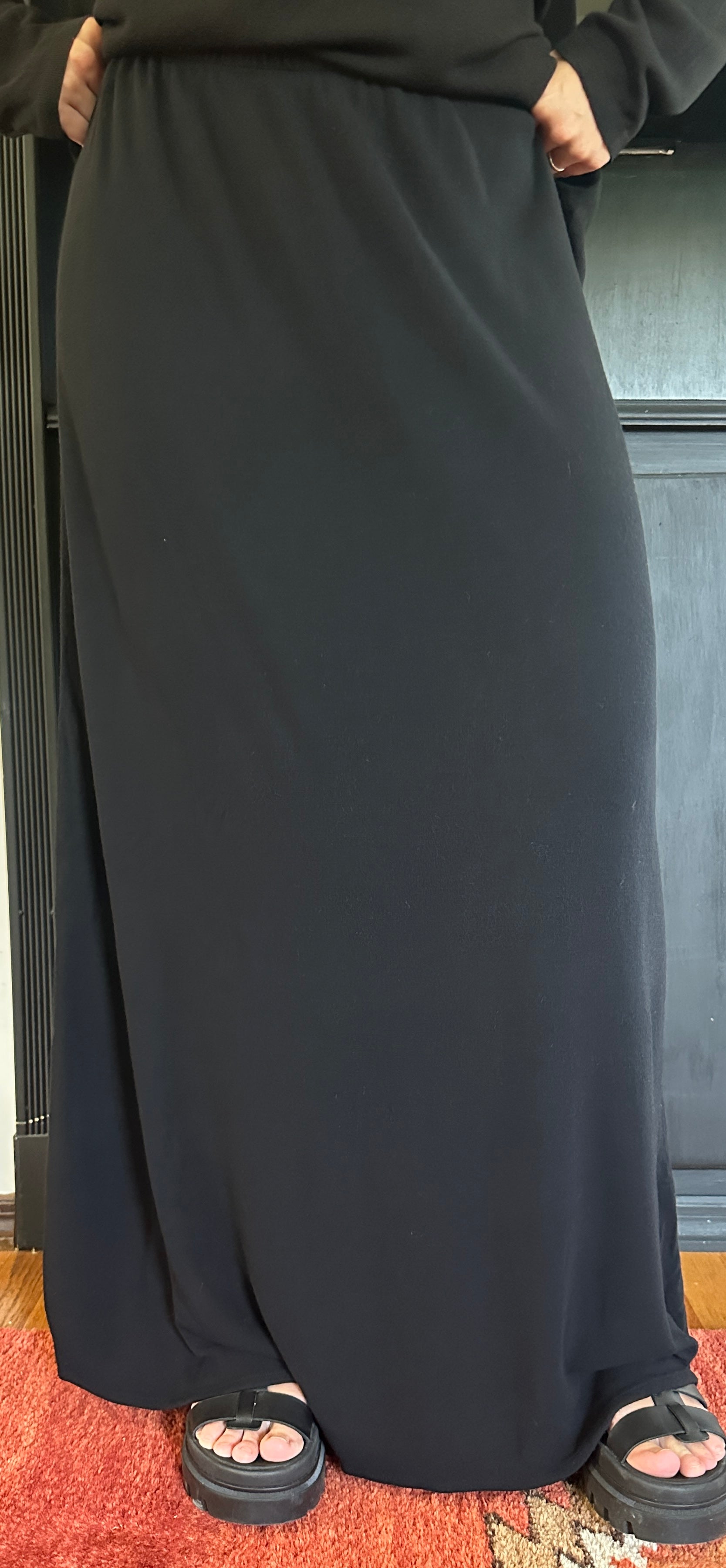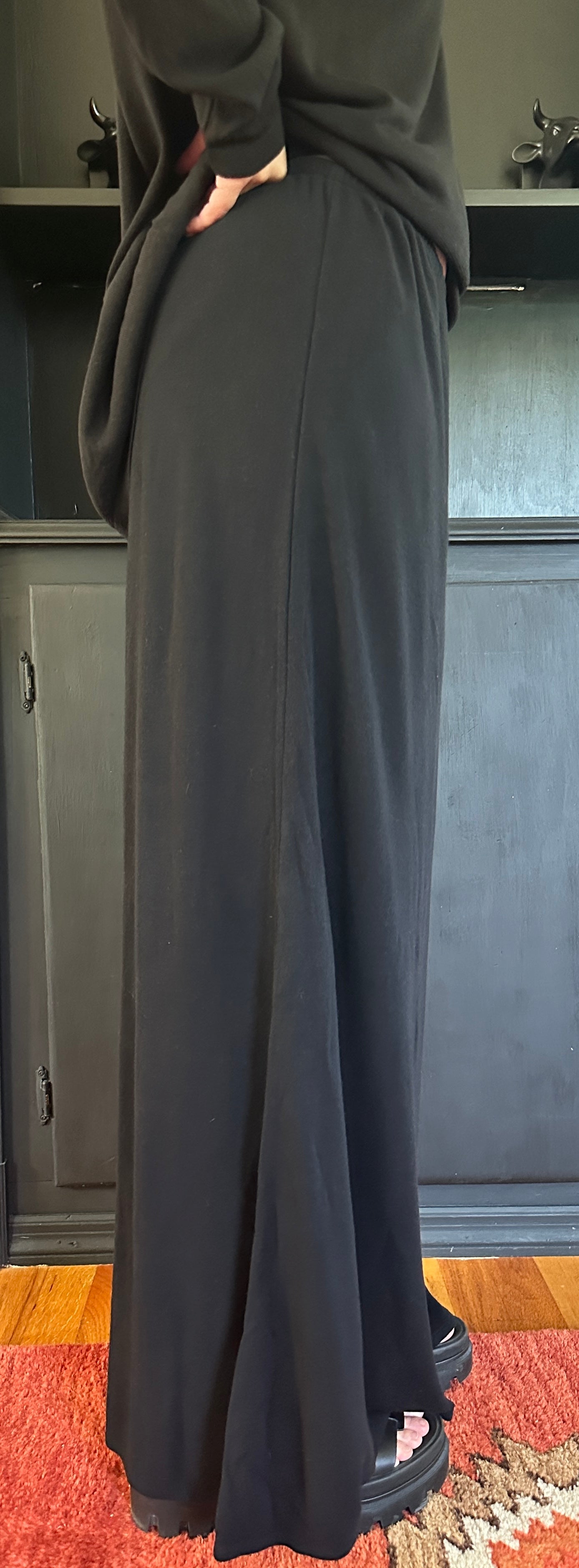 Vintage black stretch knit skirt made by Eileen Fisher. Thin elastic waistband. 100% Rayon.