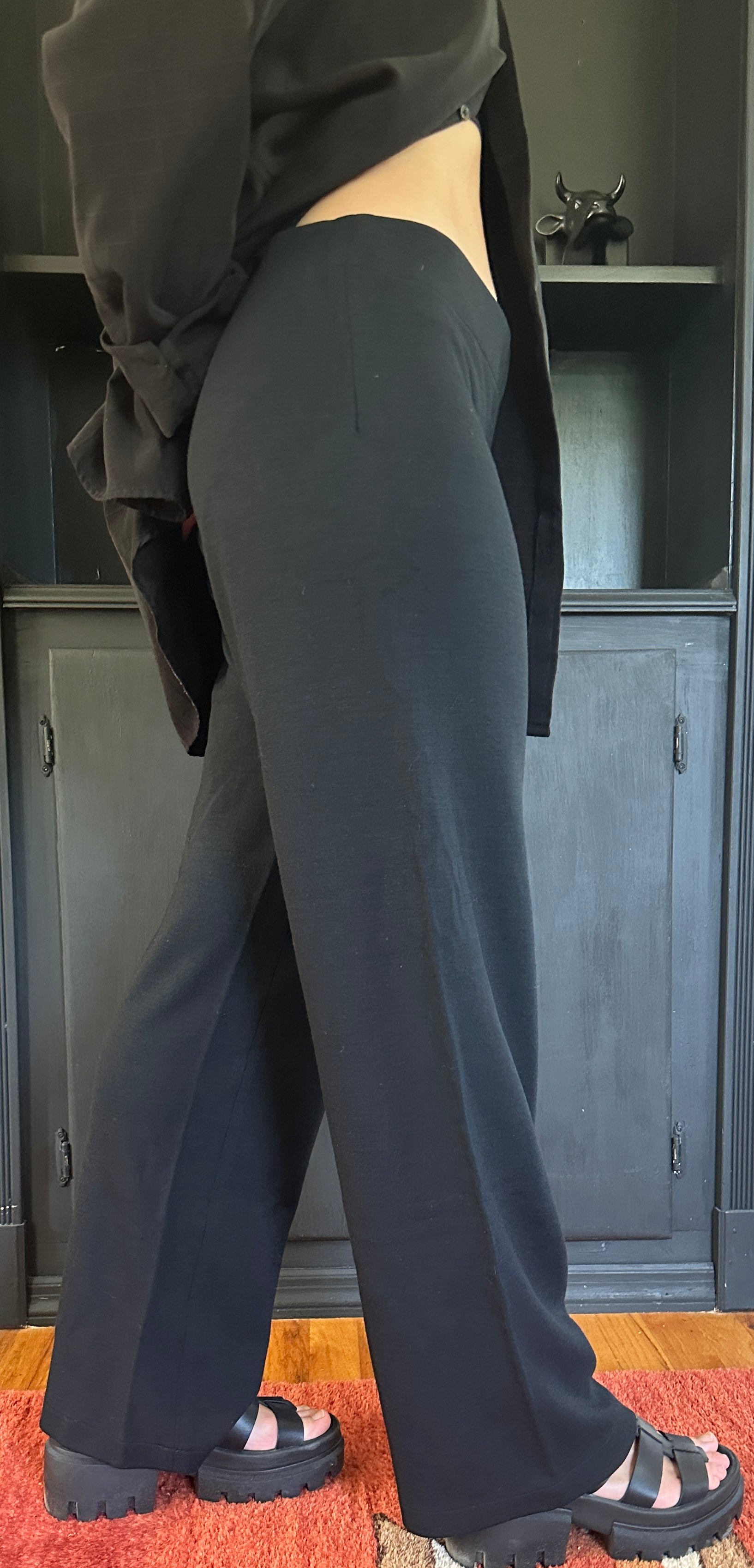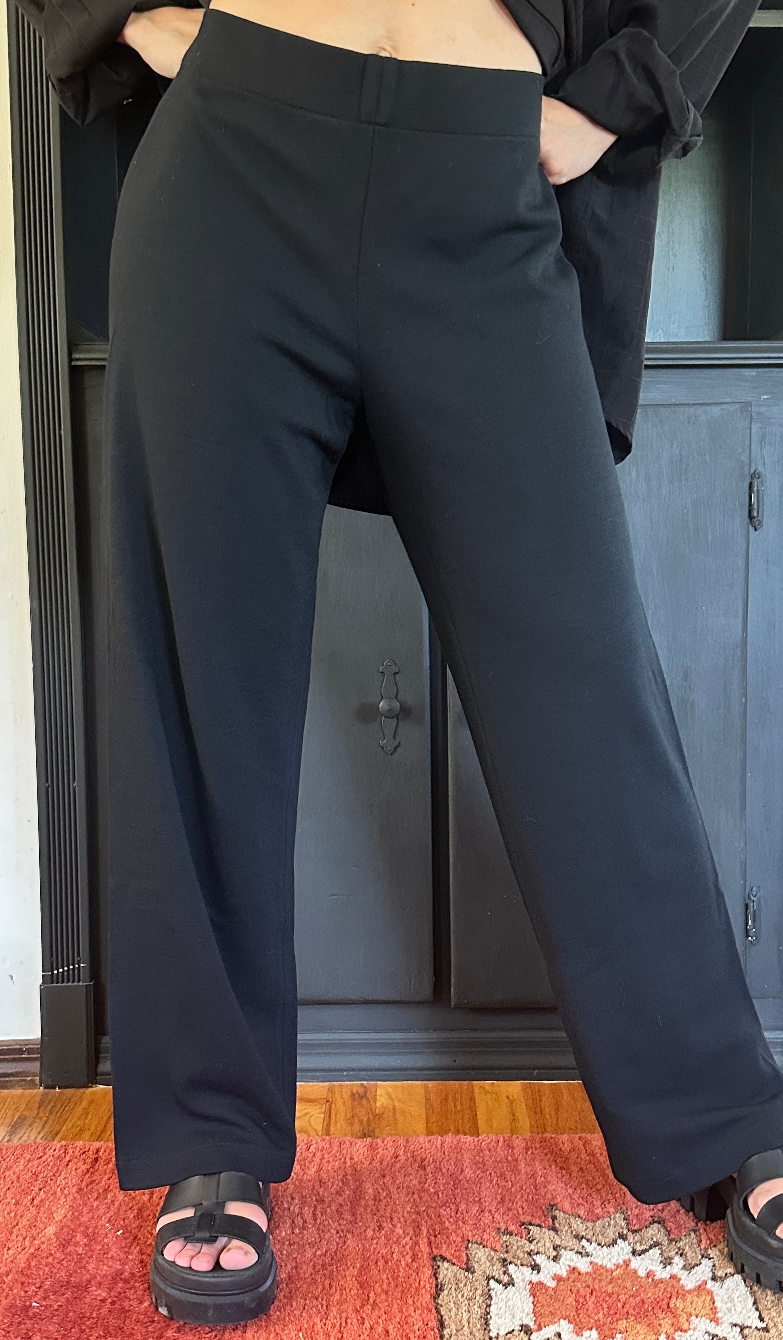 Vintage (1990s) black wide leg pant made by Eileen Fisher. Unlined. Wide elastic waistband. No pockets.