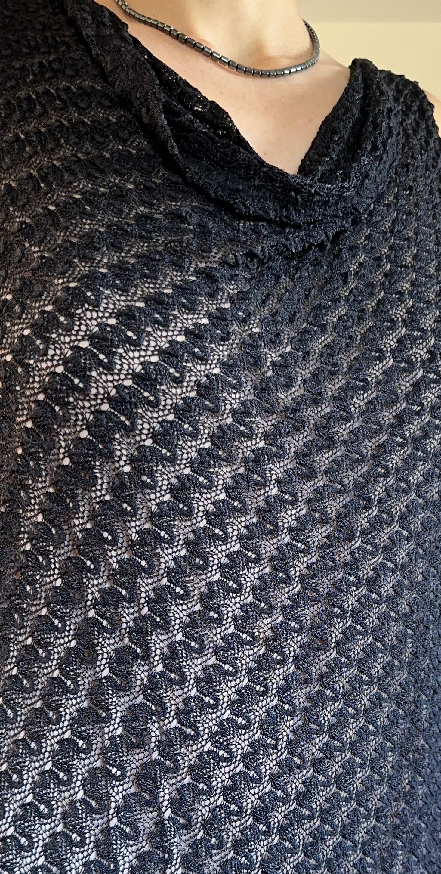 Black sheer 90s maxi dress. Cowl-neck. Pull-on. Attached nude slip. Nylon & polyester. Has stretch.