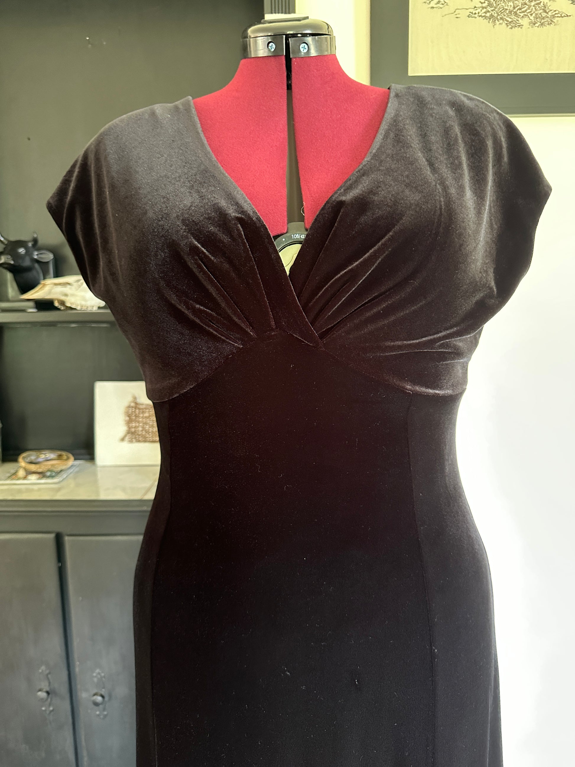 Vintage black stretch velvet baby doll dress. Pull-on. Cap sleeves. Seam under bust. Polyester spandex blend.