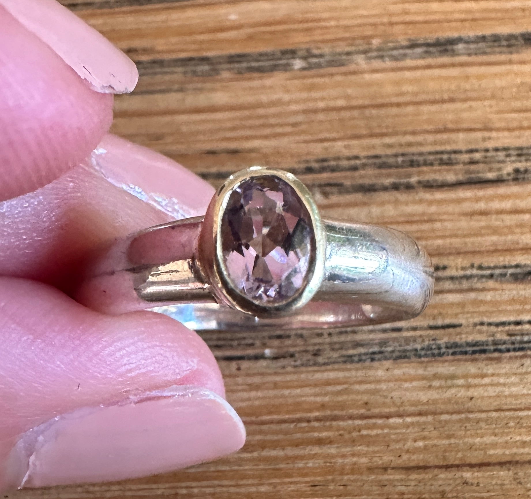 Sterling silver and gold stackable ring. Oval amethyst stone for healing, calming, and protective properties.