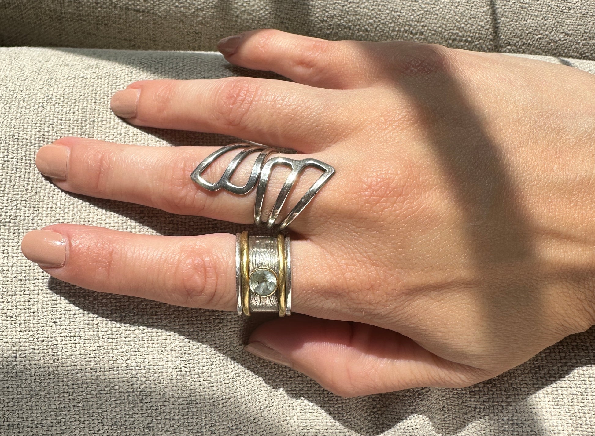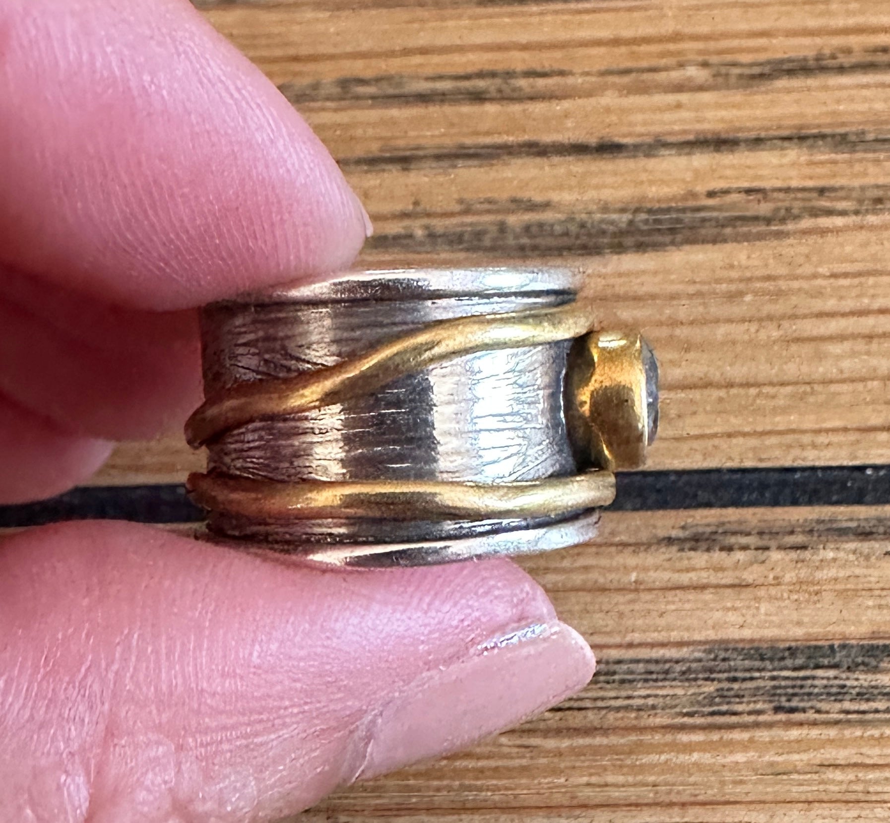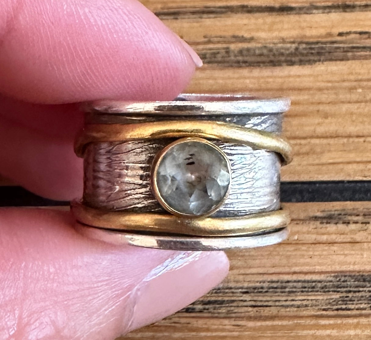 Wide band sterling silver and brass ring. Brass details rotate or spin. Round aquamarine stone for calming and protection.