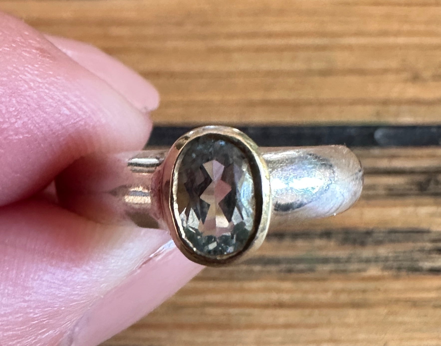 Sterling silver and gold stackable ring. Oval aquamarine stone for calming, soothing, and protection.