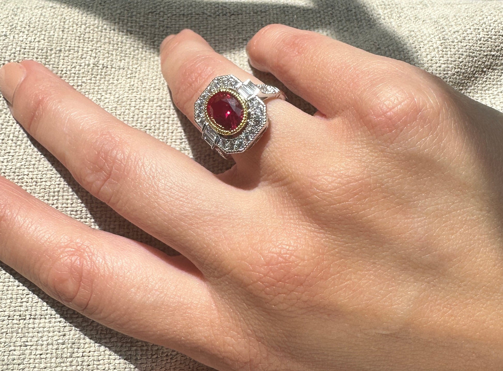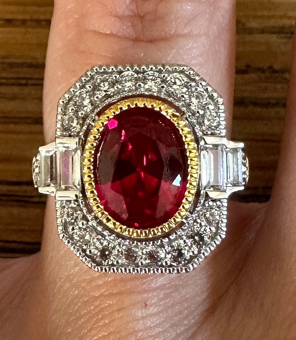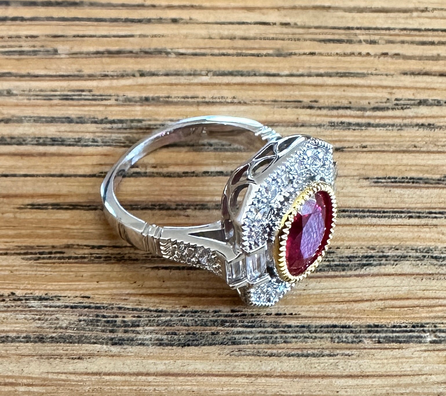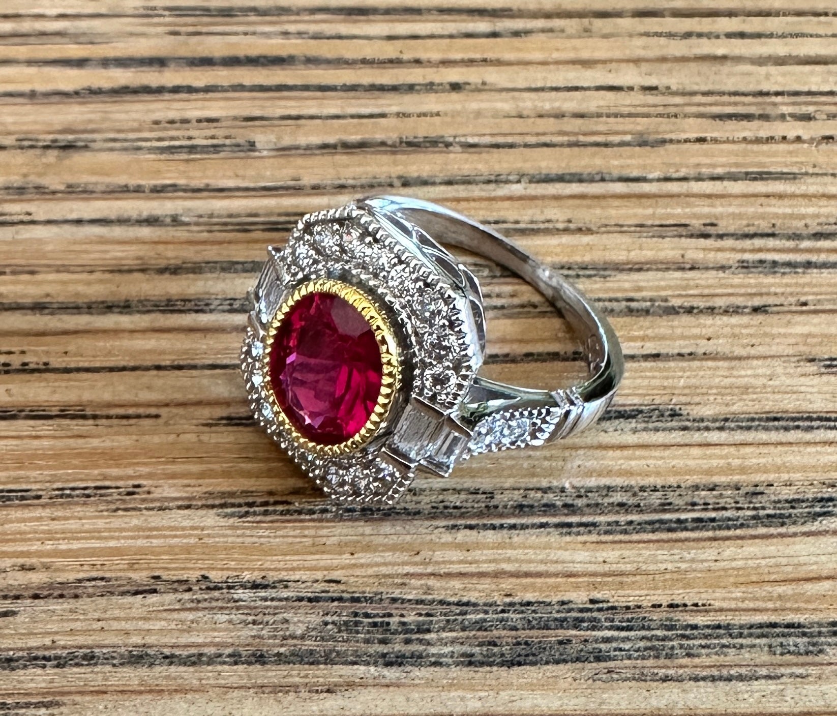 Art Deco sterling silver ring. Faux ruby and diamonds. High quality costume jewelry.