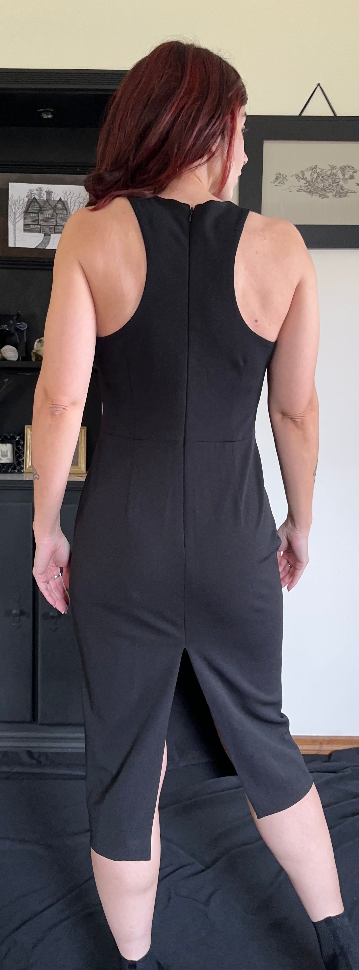 Secondhand black Betsey Johnson midi dress. Crew neck with racer back. Sleeveless. Floral rose applique. Back zipper. Polyester spandex blend.