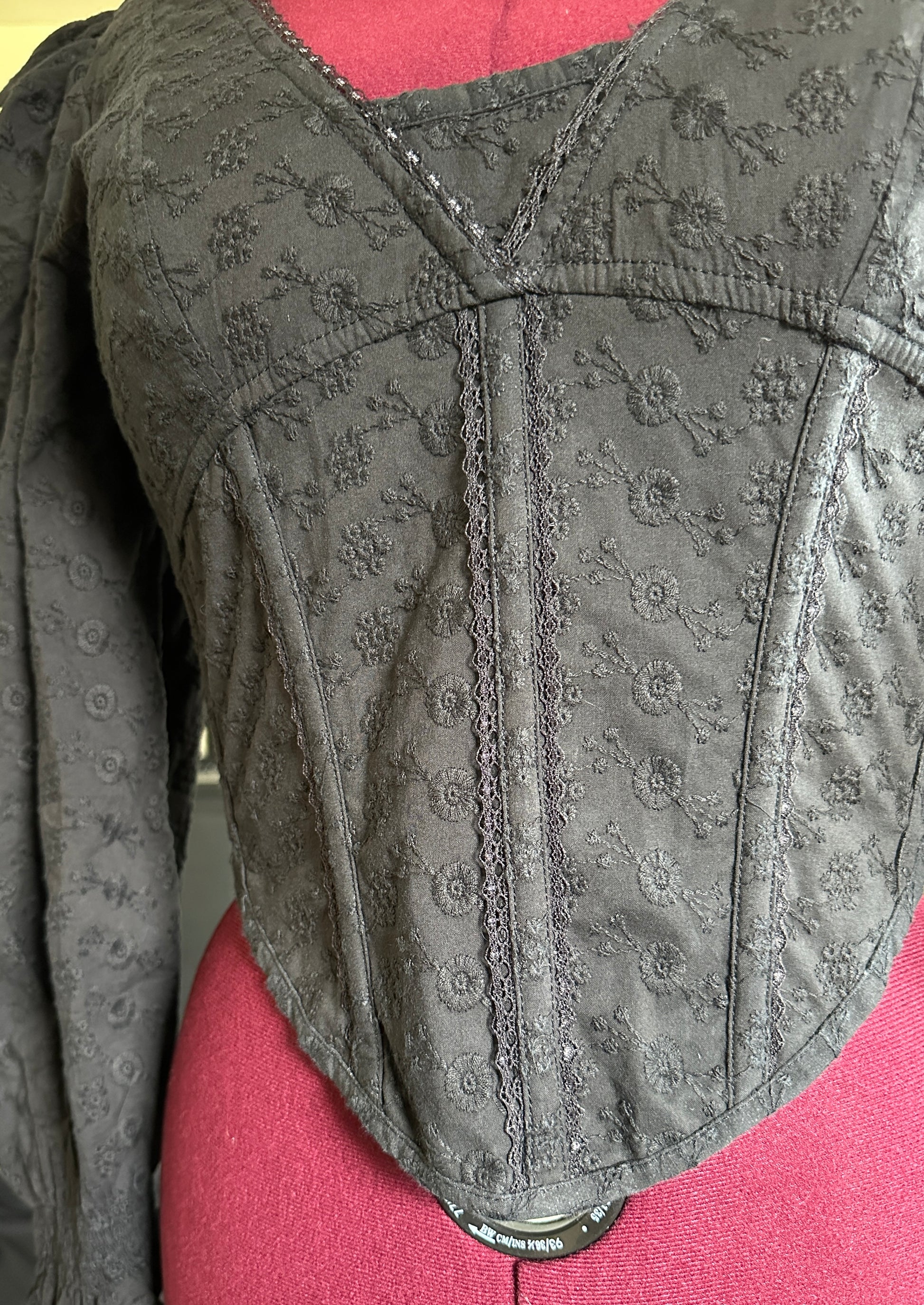 Secondhand black cotton corseted top. V-neck. Long puff sleeves with elastic at wrist. Boning around waist. Black zipper on back.