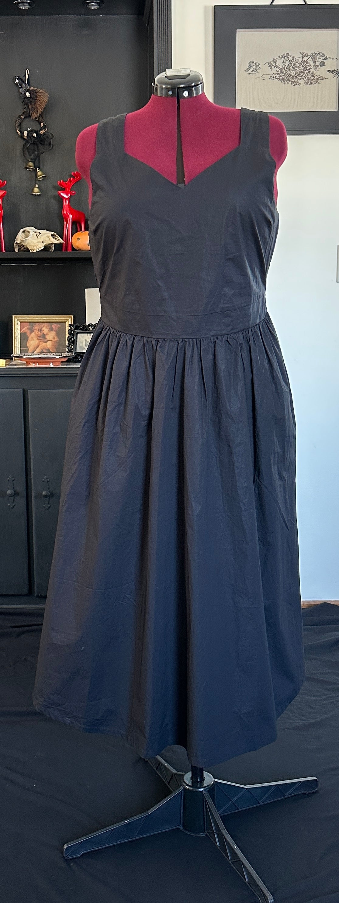 Black 100% cotton sleeveless dress. V-neckline with wide tank straps. Full knee-length skirt with side slash pockets. Back of bodice is smocked. Belt Not Included.