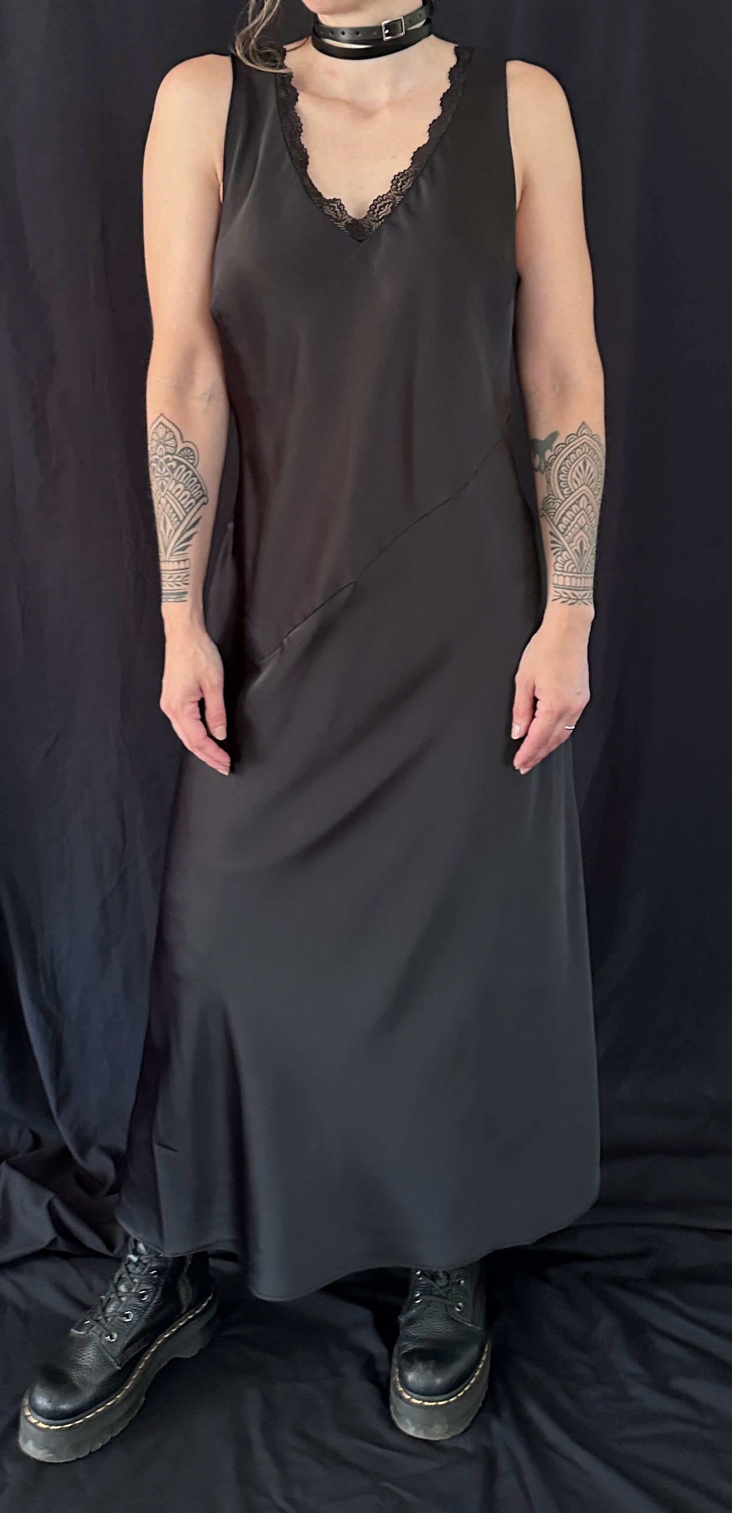 Secondhand 90s style Nicole Miller black satin bias cut slip dress with lace trim. Body skimming full length with side zipper. Polyester spandex blend gives some stretch. Pinned on model to show silhouette.