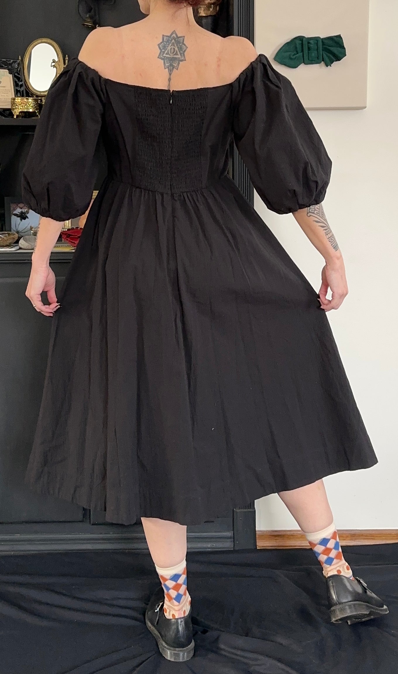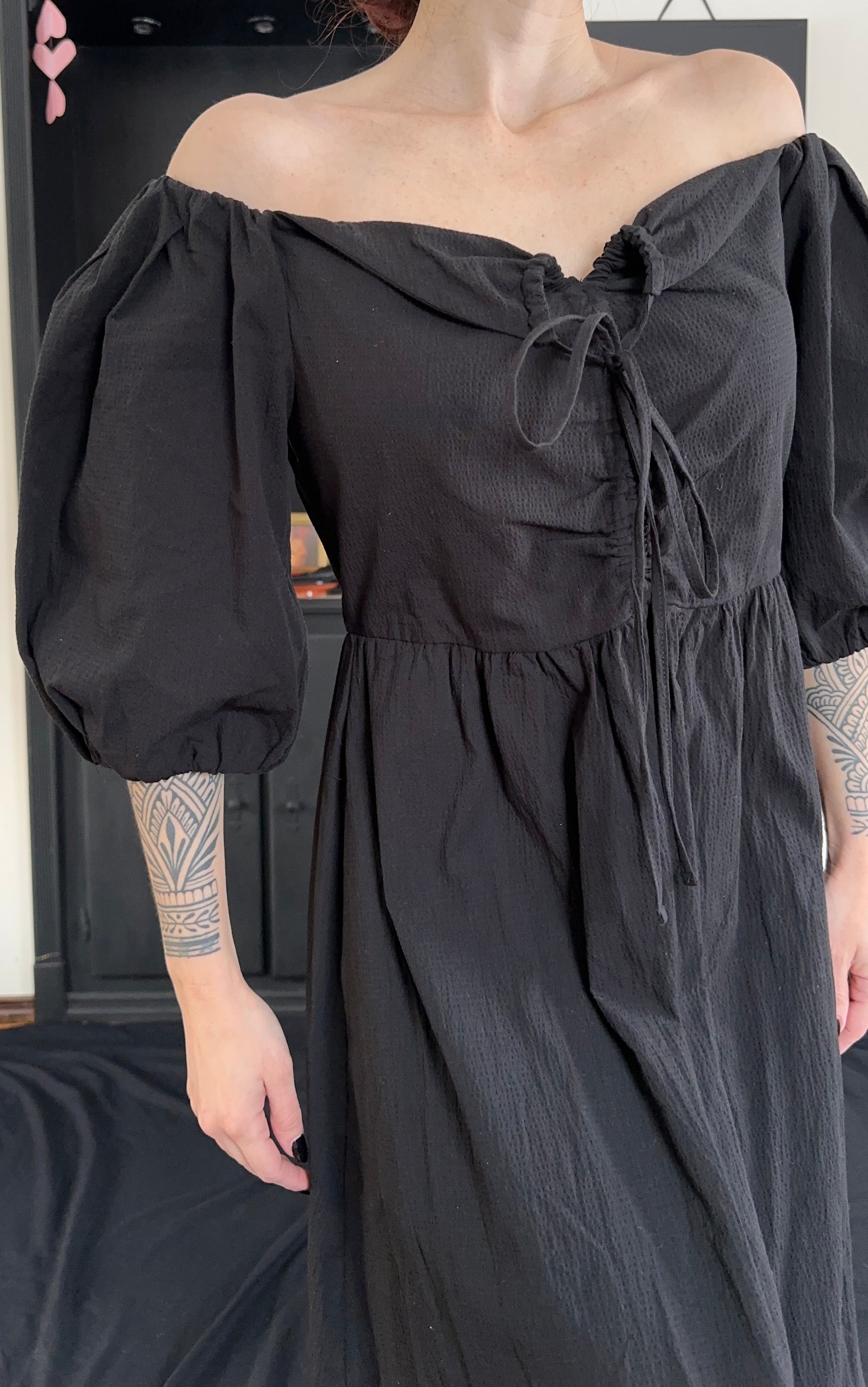 Secondhand black seersucker midi dress. Puff sleeves can be worn on or off the shoulder. Ruched back with zipper. A-line skirt with side pockets. 99% cotton, 1% spandex.