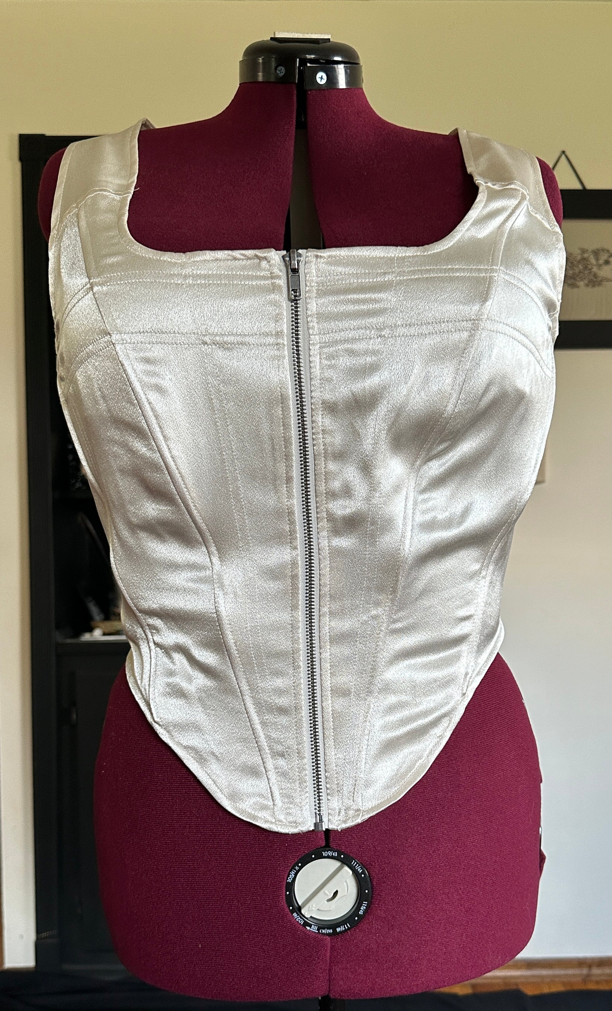 Vintage cream satin zip front bodice. Silver metal zipper. Wired boning. 100% polyester.