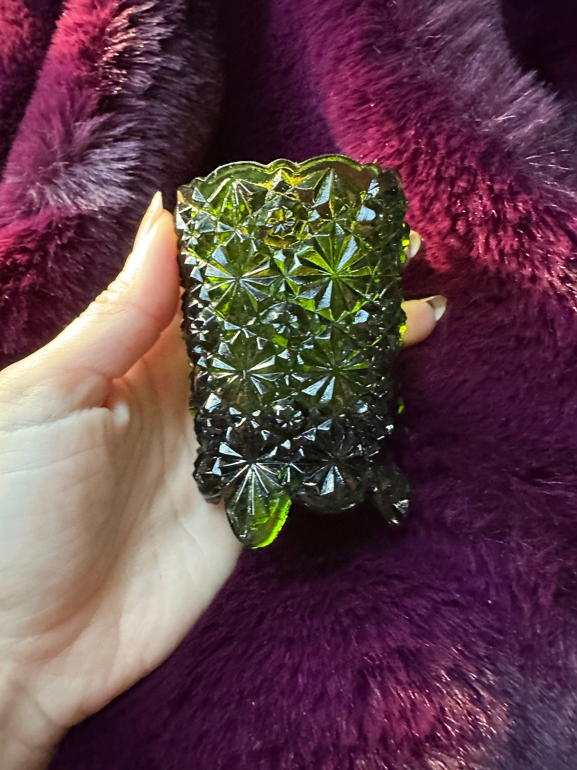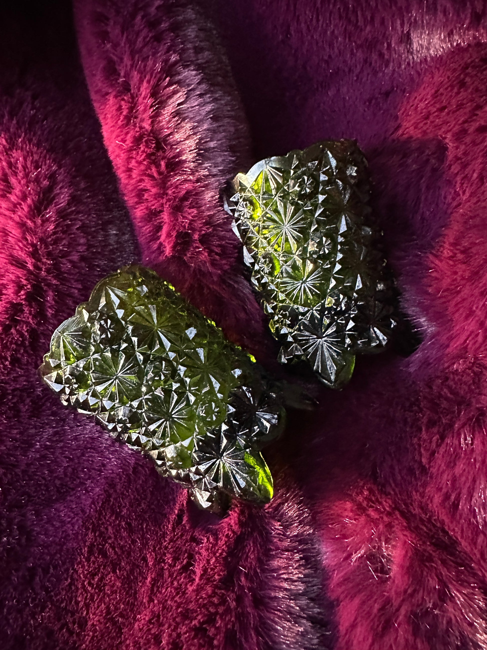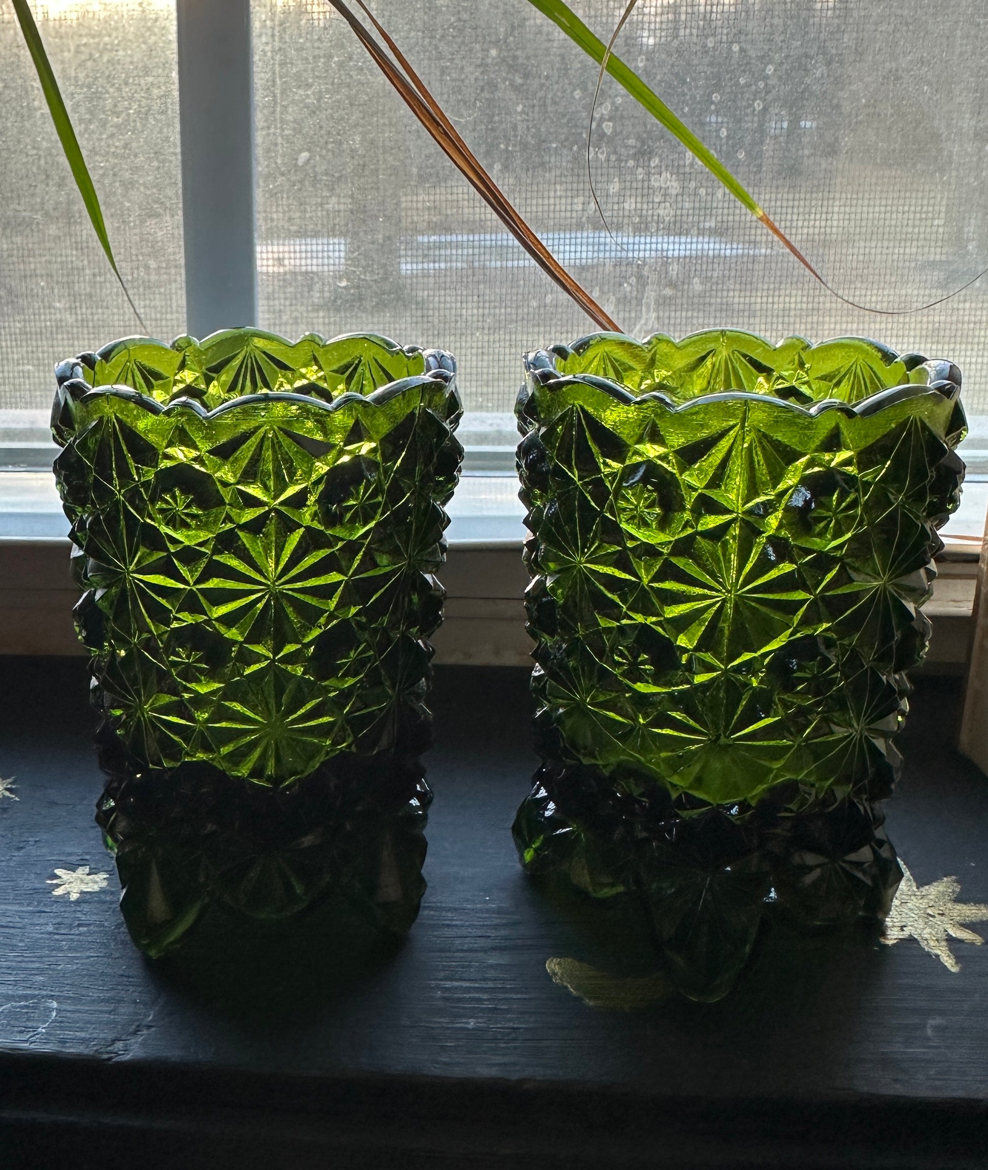 Vintage green cut glass set of votive candle holders. Geometric starburst pattern.