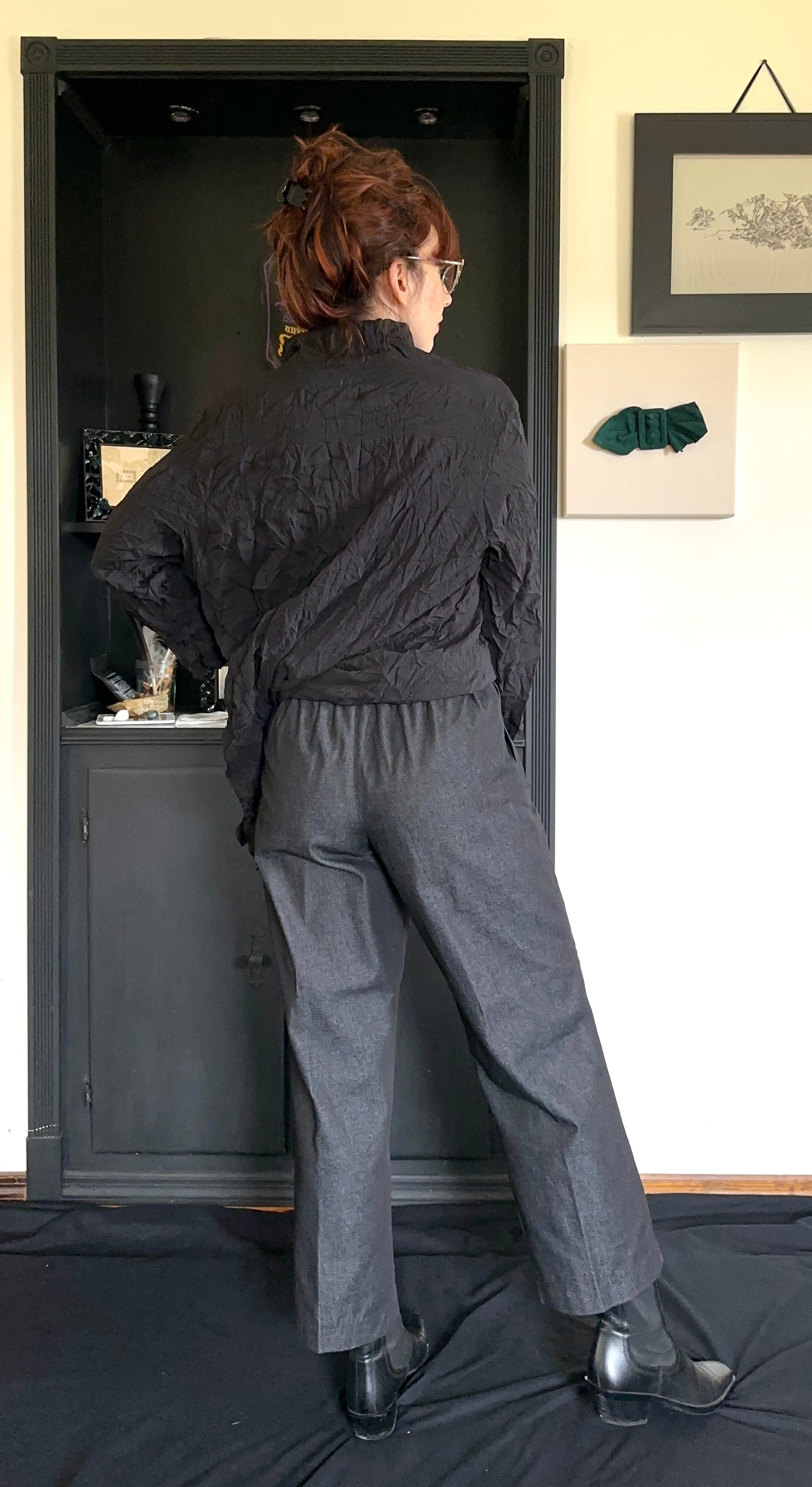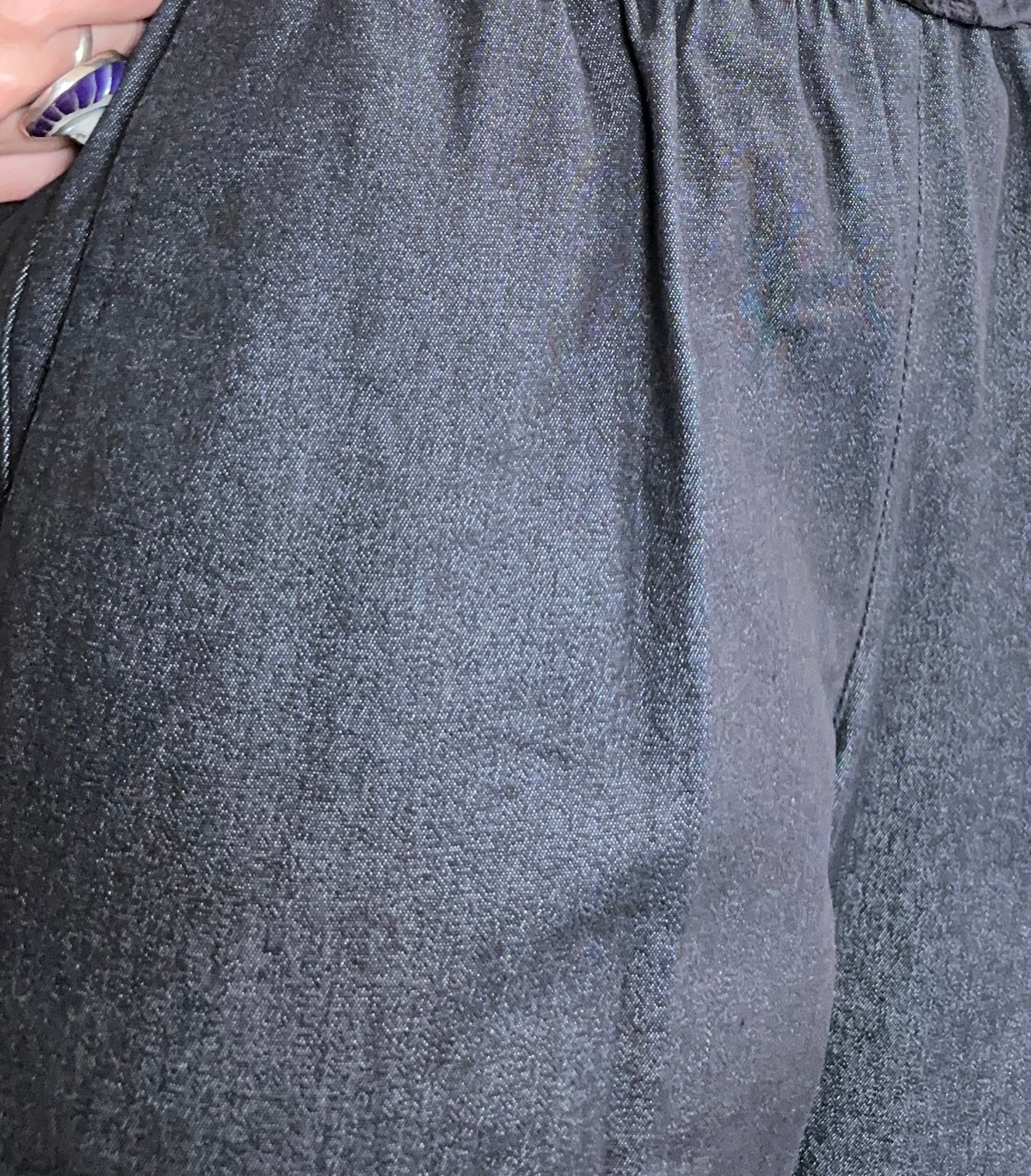 Secondhand dark grey pleated pull on stretch denim pants. Side slash pockets. Elastic waistband. Cotton, polyester, and spandex blend.