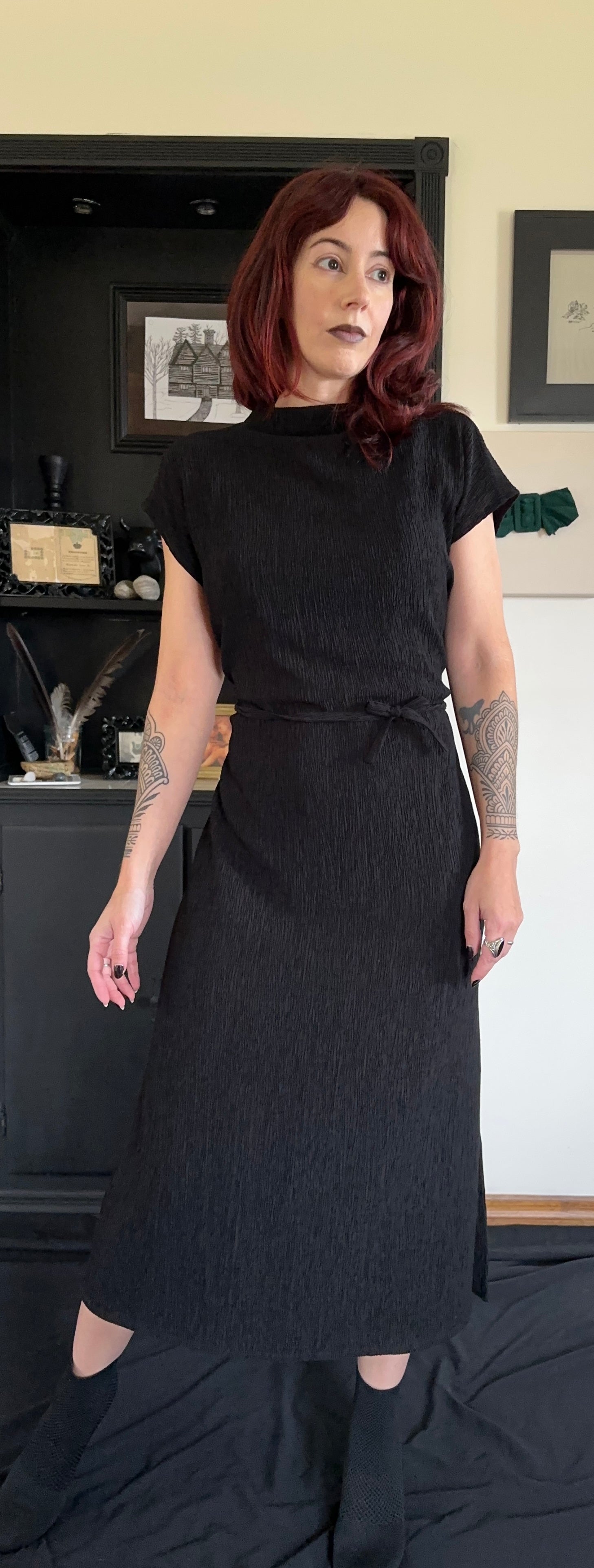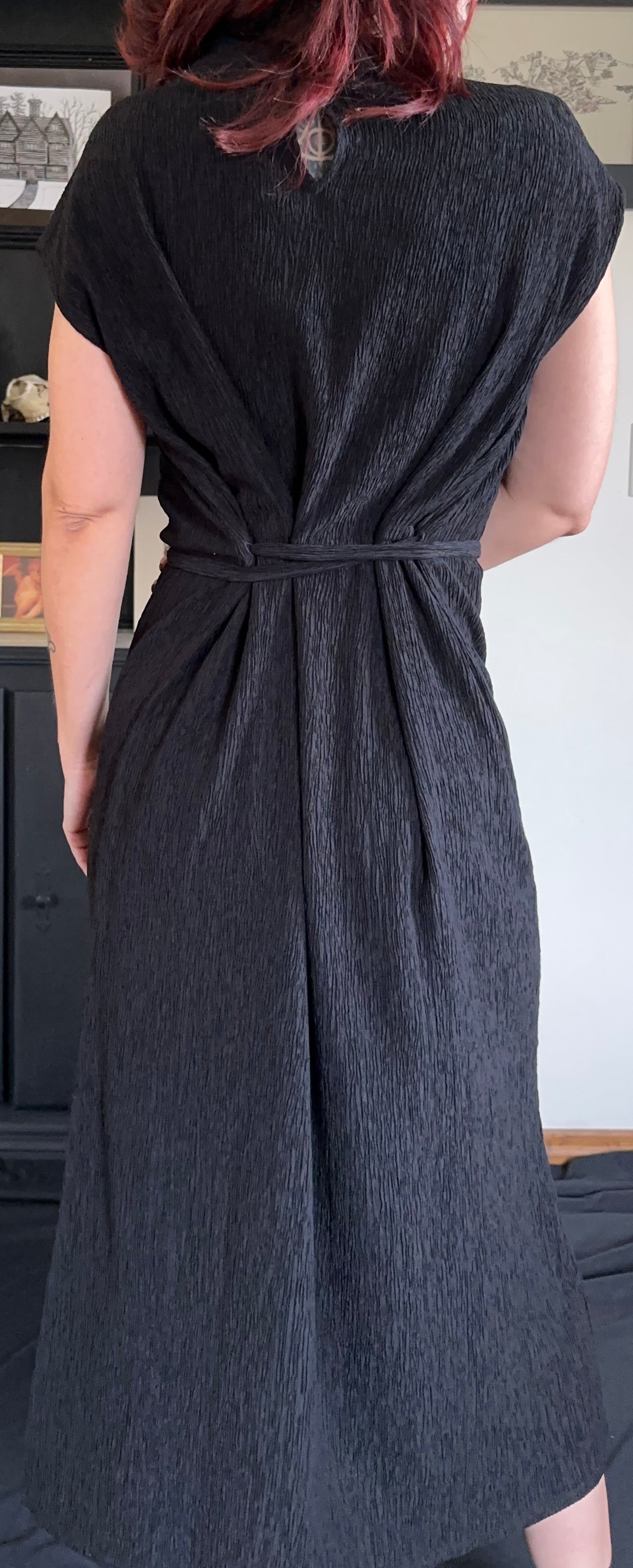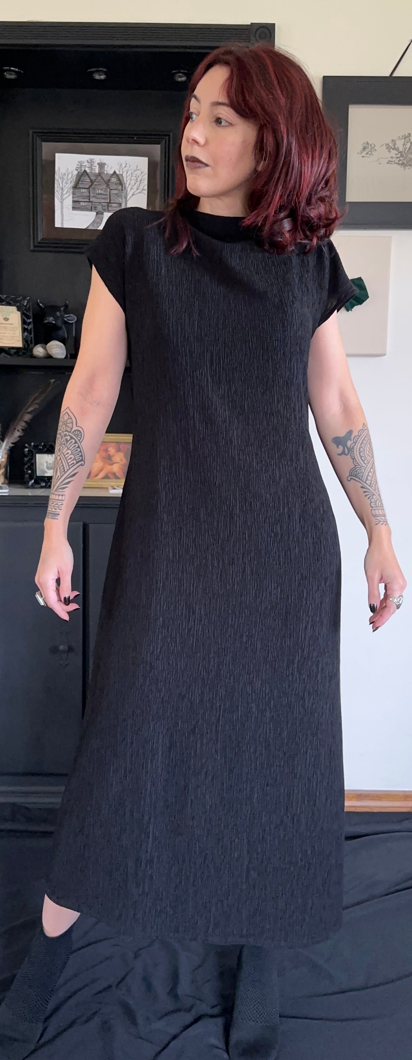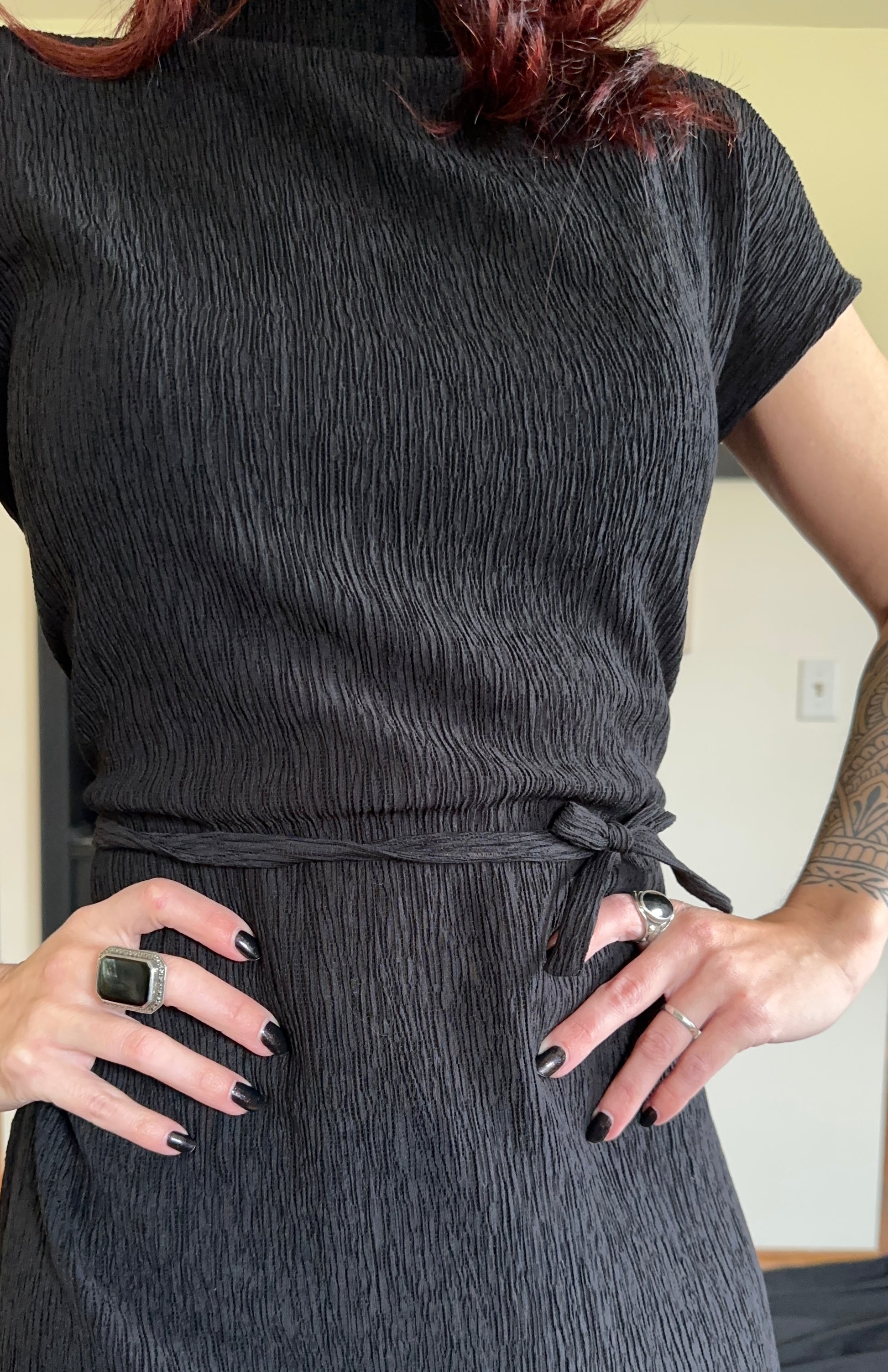 New lightweight crinkle Eileen Fisher black midi dress. Short sleeve. Mock neck. Pull-on with button closure at back of neck. Can be worn loose or tied for a fitted look. High side slits. Tencel, lyocell, polyester, and spandex blend.