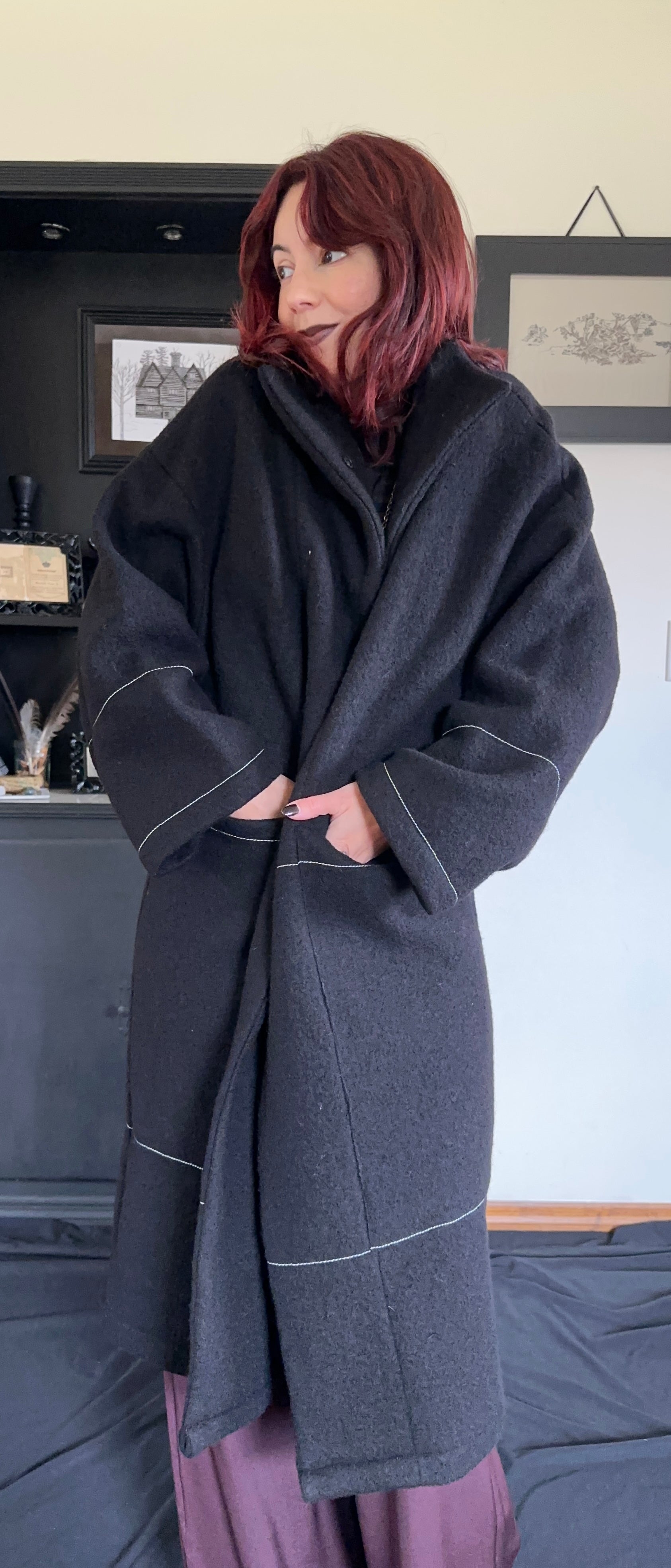 Secondhand black Elemente Clemente boucle wool coat. White contrast stitching. Snap front closures. Extra large front patch pockets. Relaxed fit. Unlined. 100% Virgin Wool.