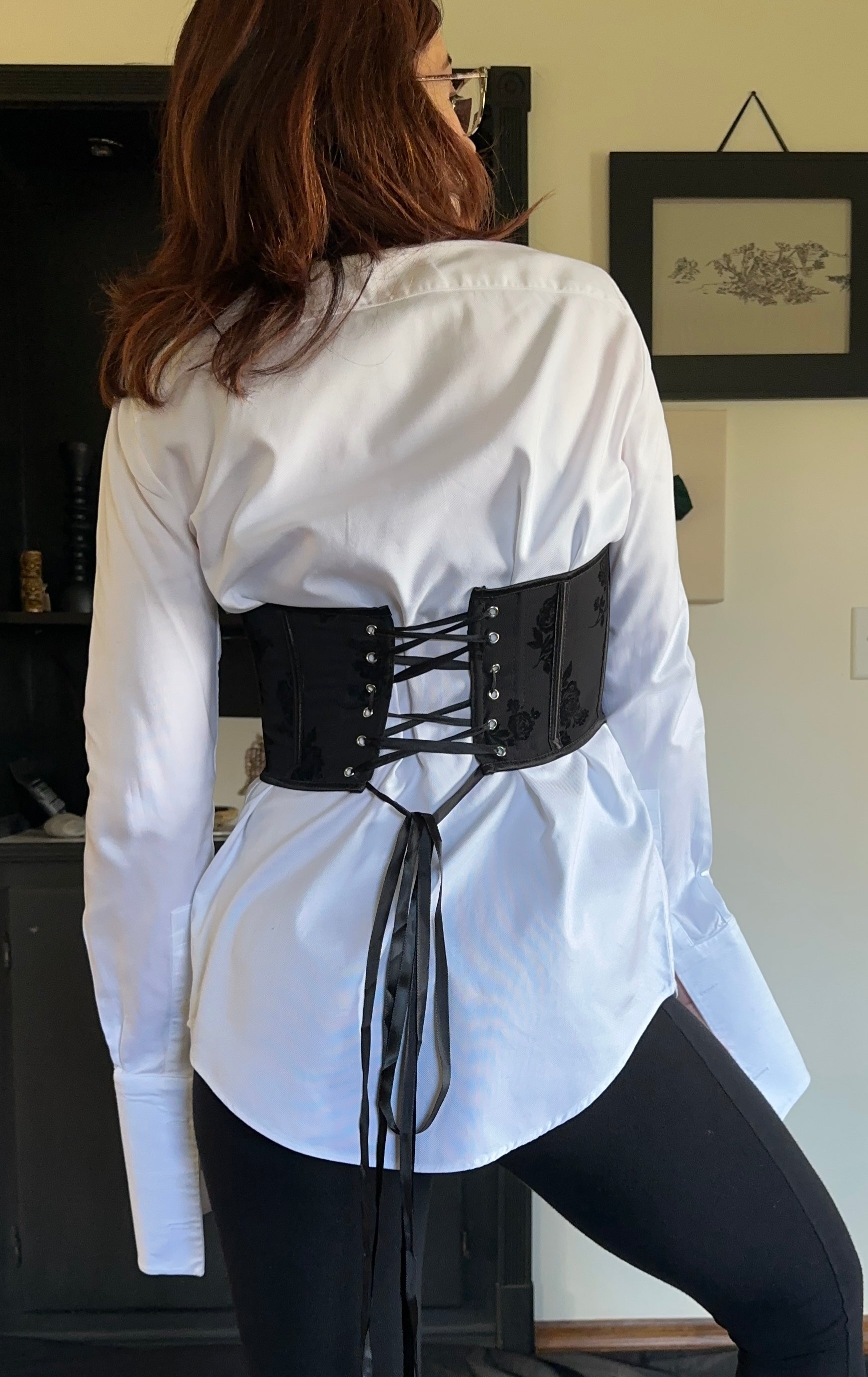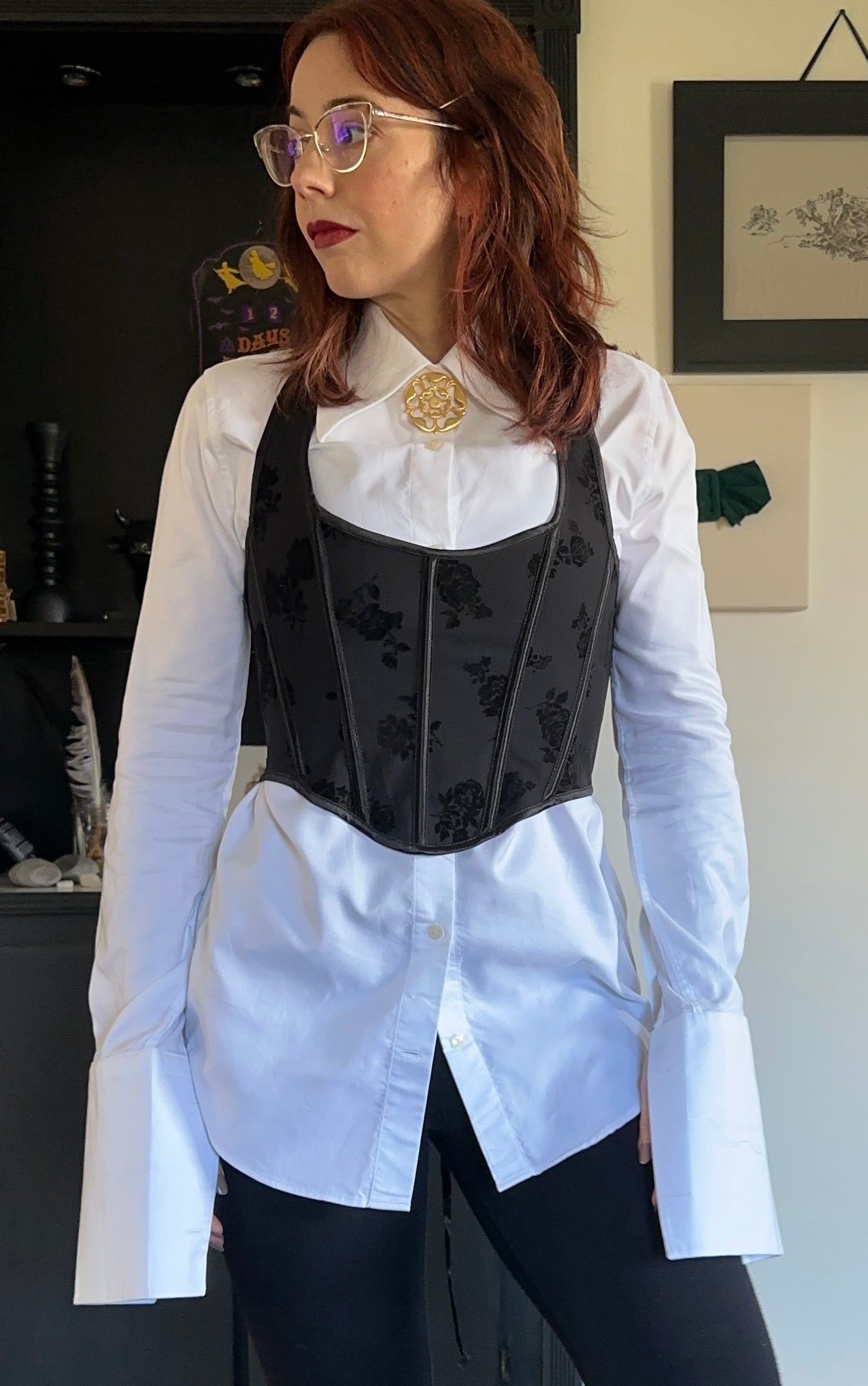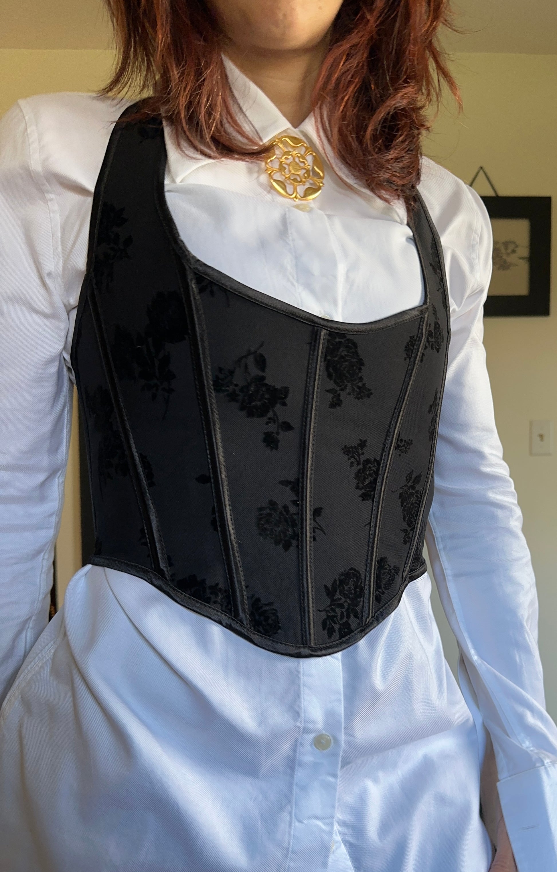 Secondhand black flocked floral lace-up corset. Halter neck. Plastic boning. Satin ribbon laces. Polyester elastane blend.