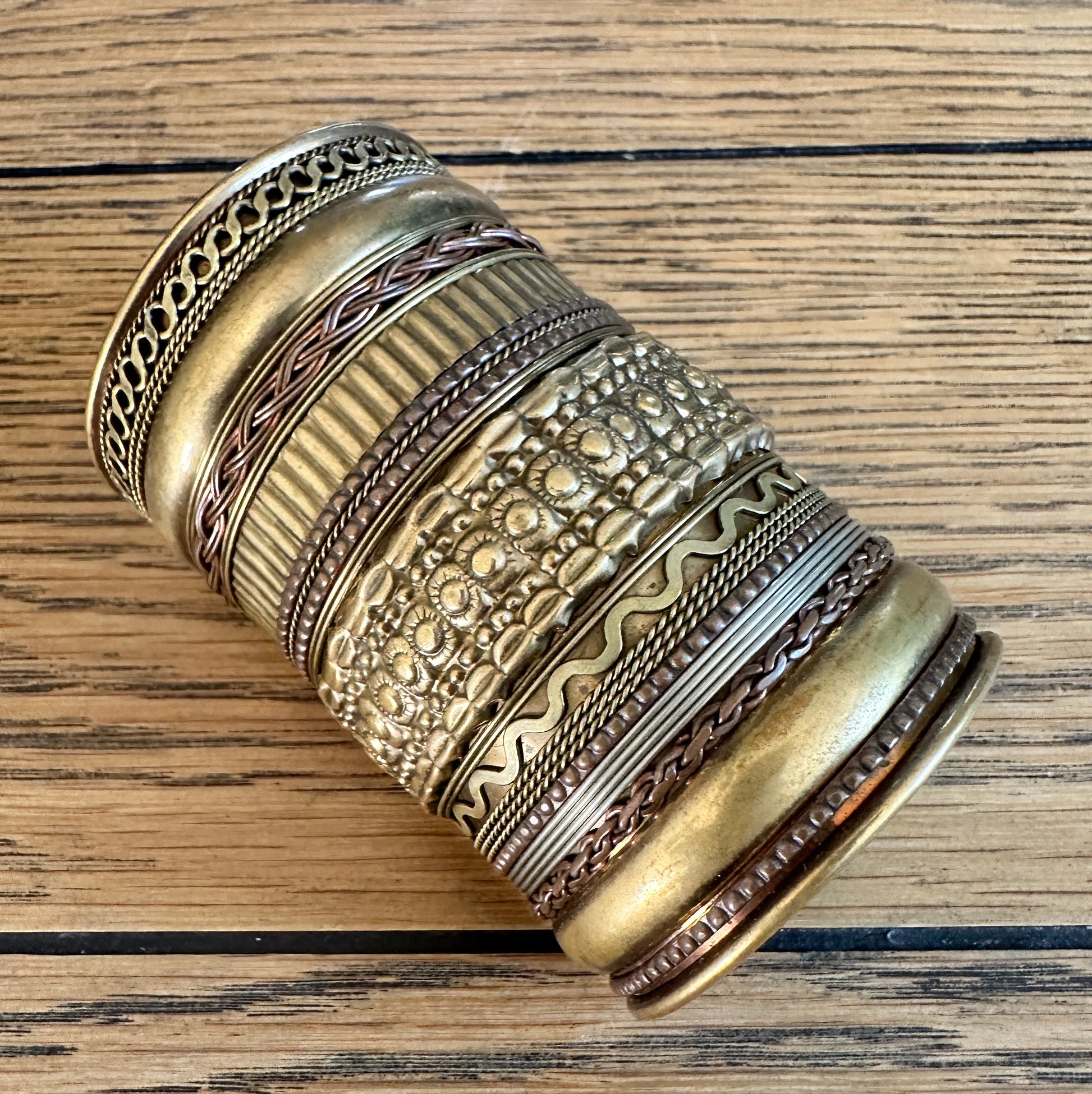 Brass, Copper, and Silver large cuff bracelet.