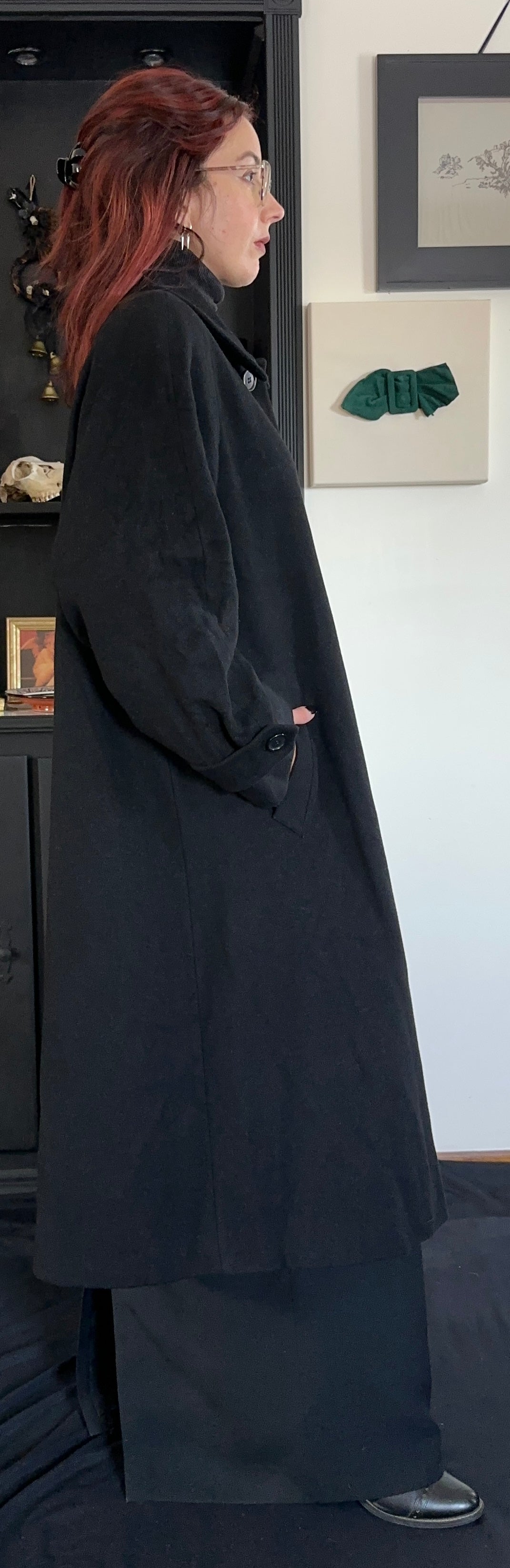 Vintage black button front wool coat. Below the knee length. Side slash pockets. Black acrylic buttons down front and at cuffs. Relaxed A-line silhouette. 100% wool exterior lined in acetate. Made in the U.S.
