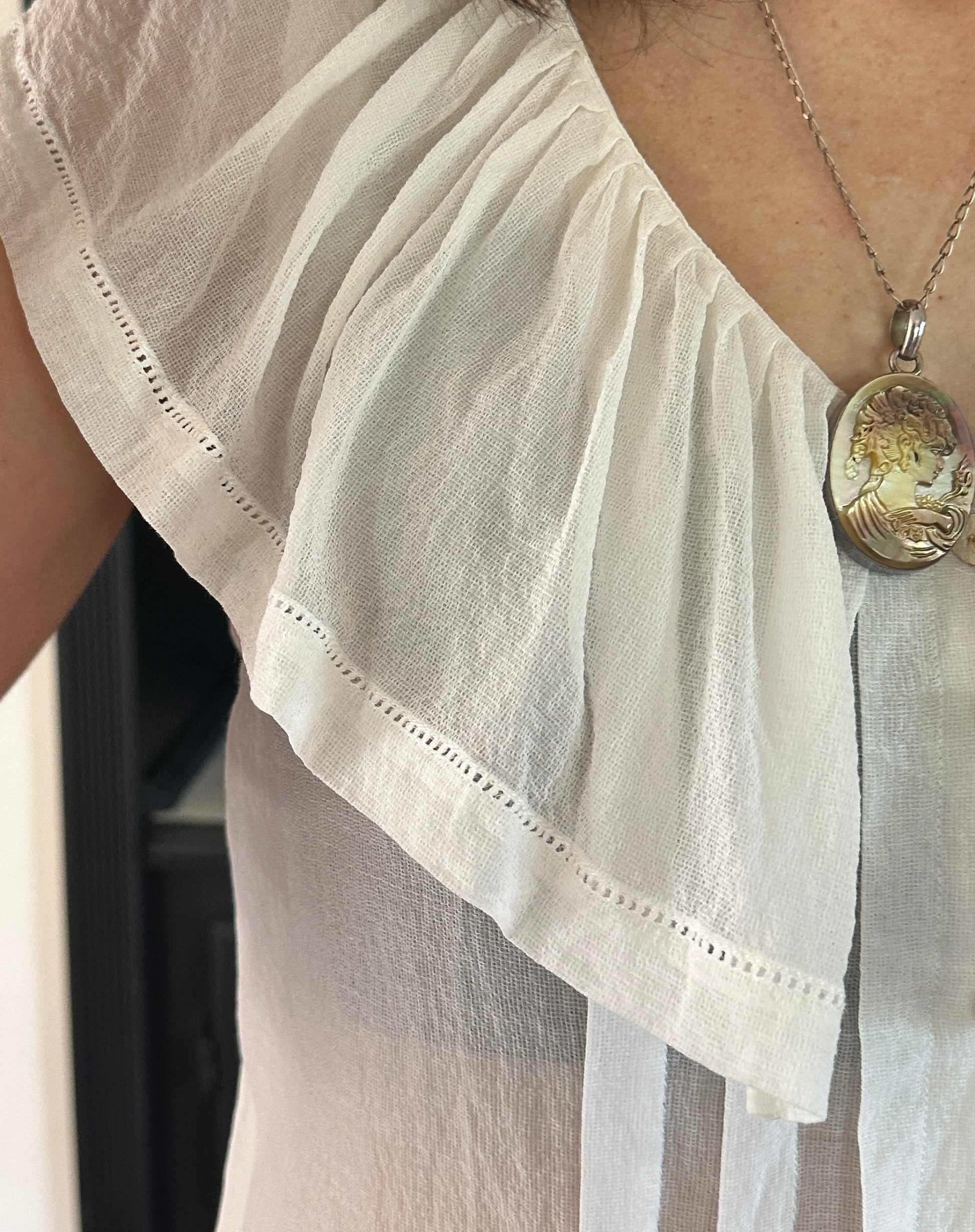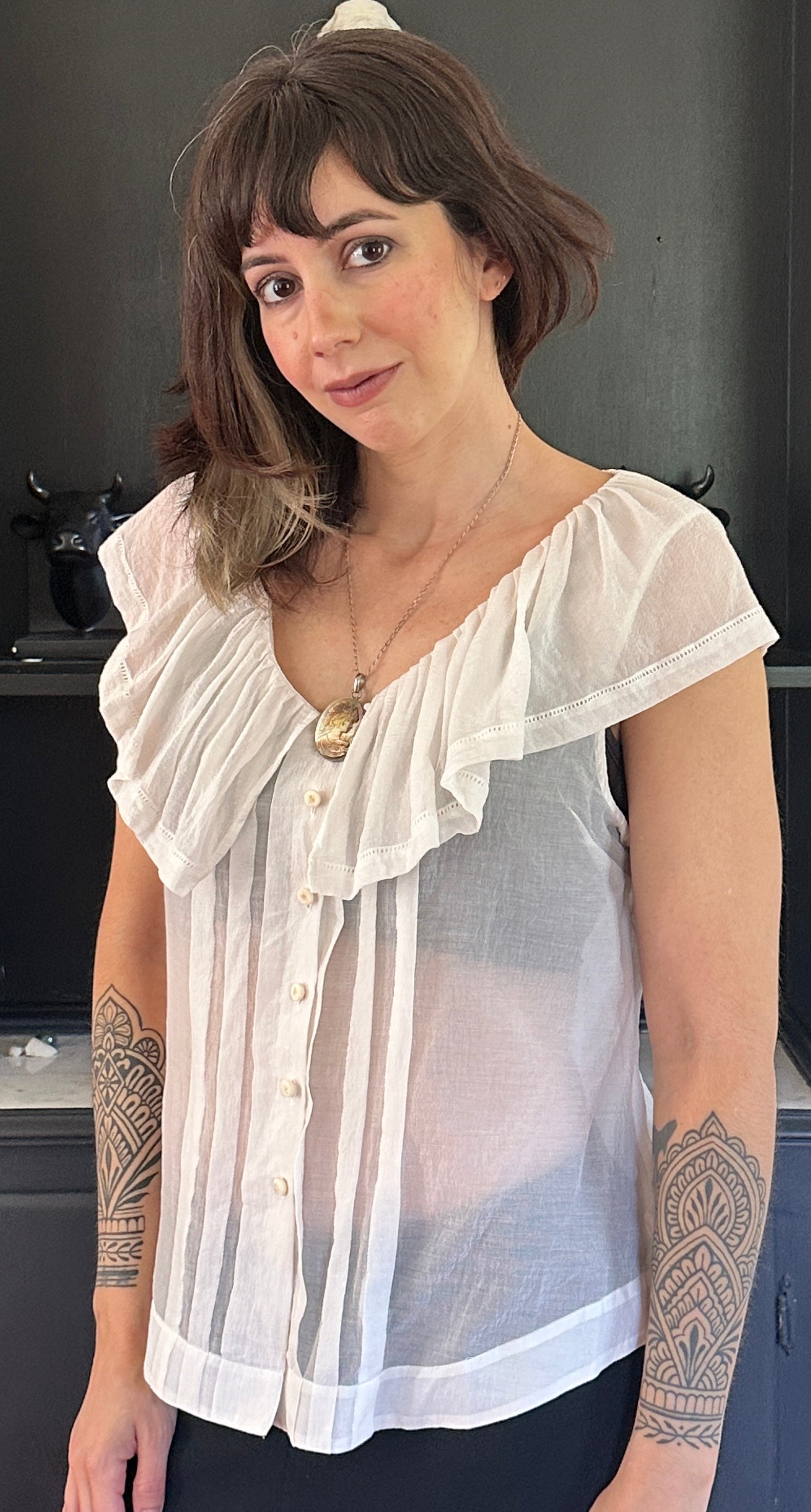 Secondhand cream colored silk and cotton ruffled blouse made by Moulinette Soeurs.