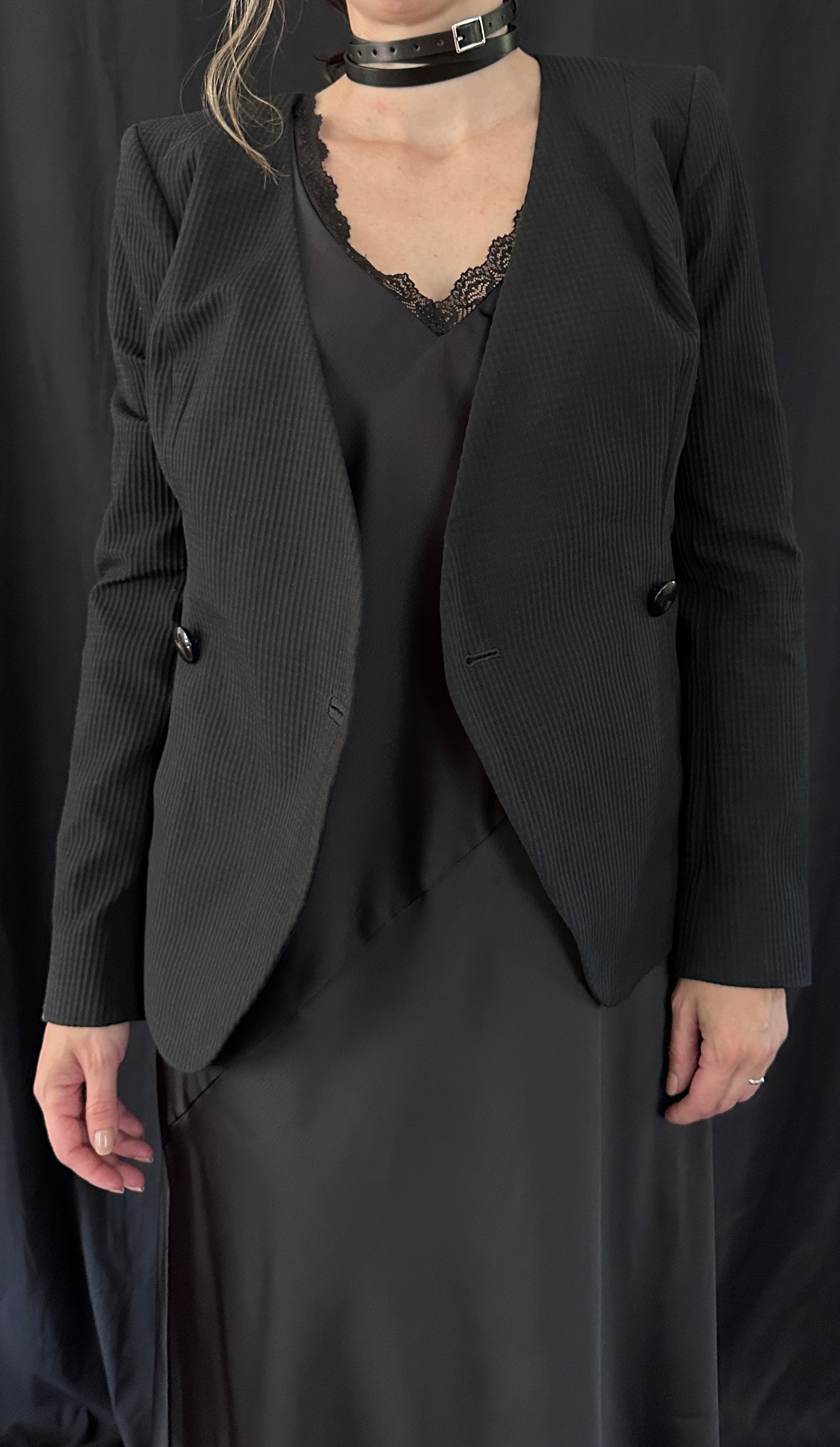 Secondhand Brooks Brothers black and midnight blue gingham stretch blazer. Nylon & cotton blend. No pockets. No signs of use.
