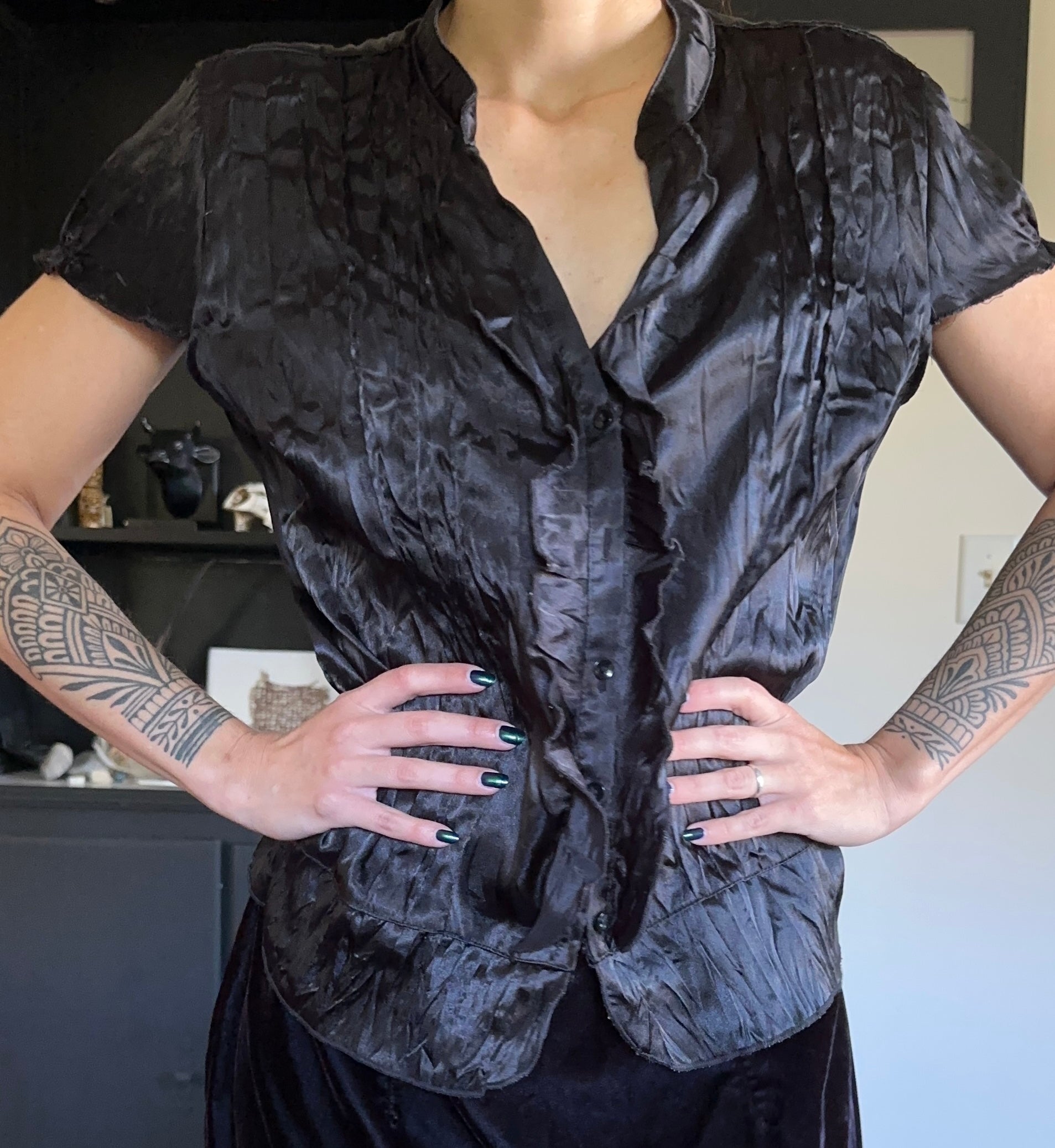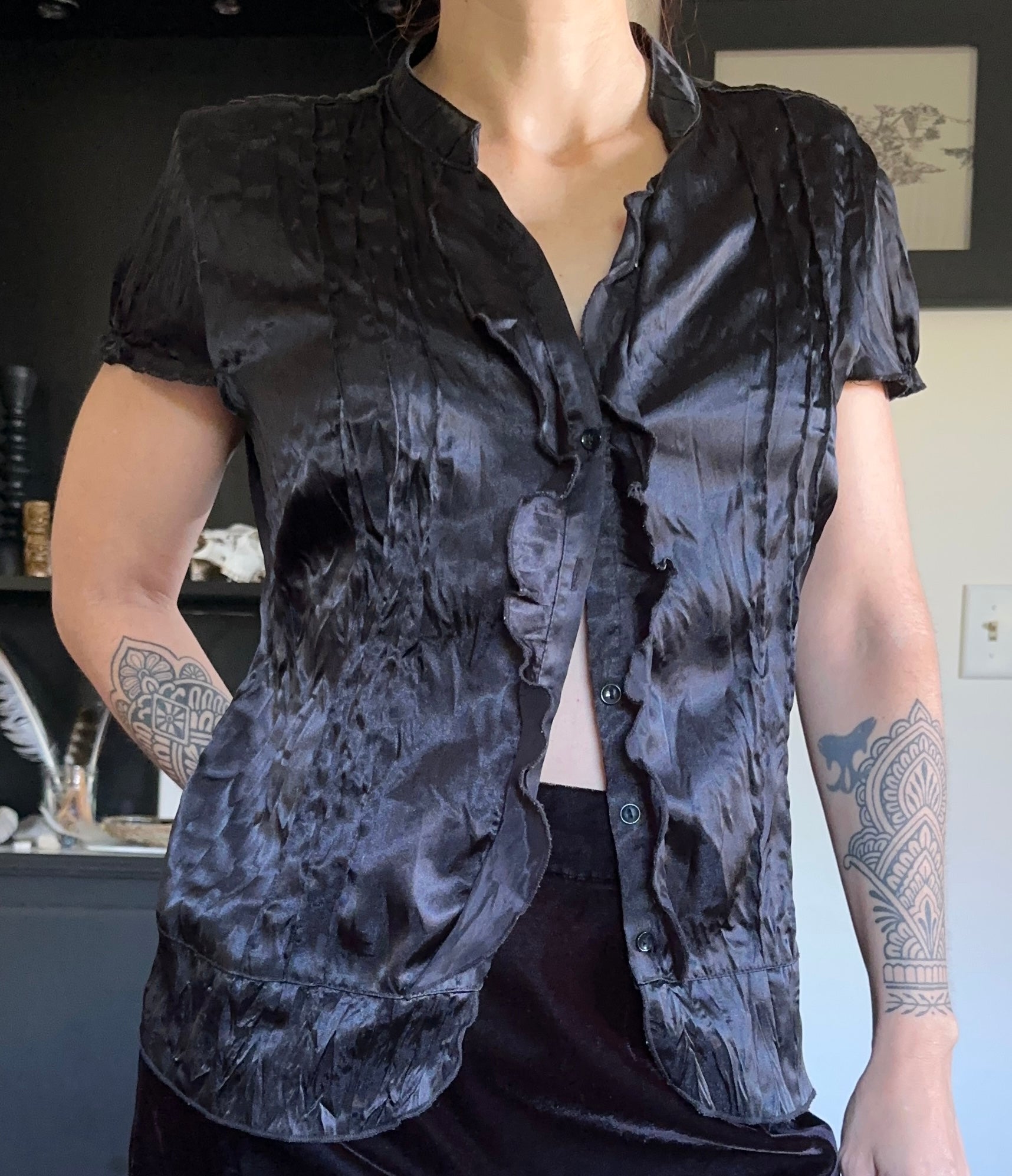 Vintage black satin button front top. Ruffled placket. Short sleeve with ruffle trim. 100% polyester. Vintage/used item - has signs of wear.