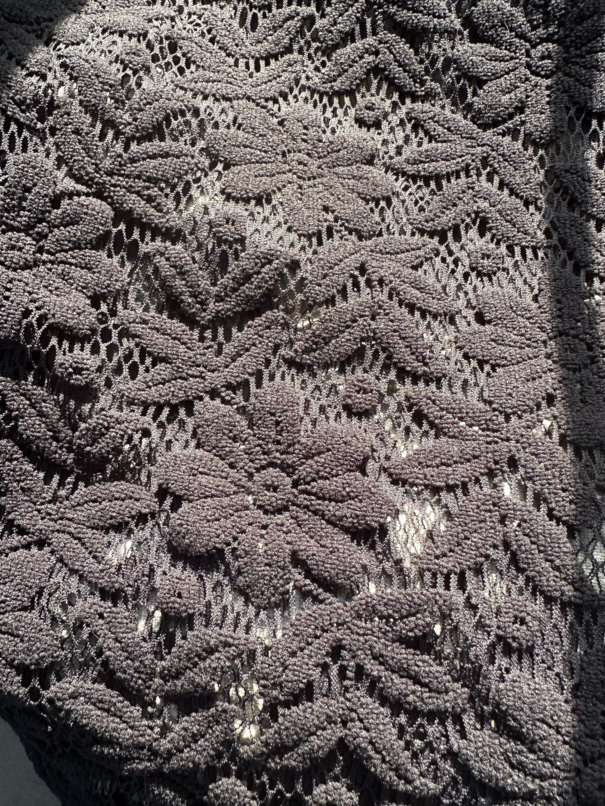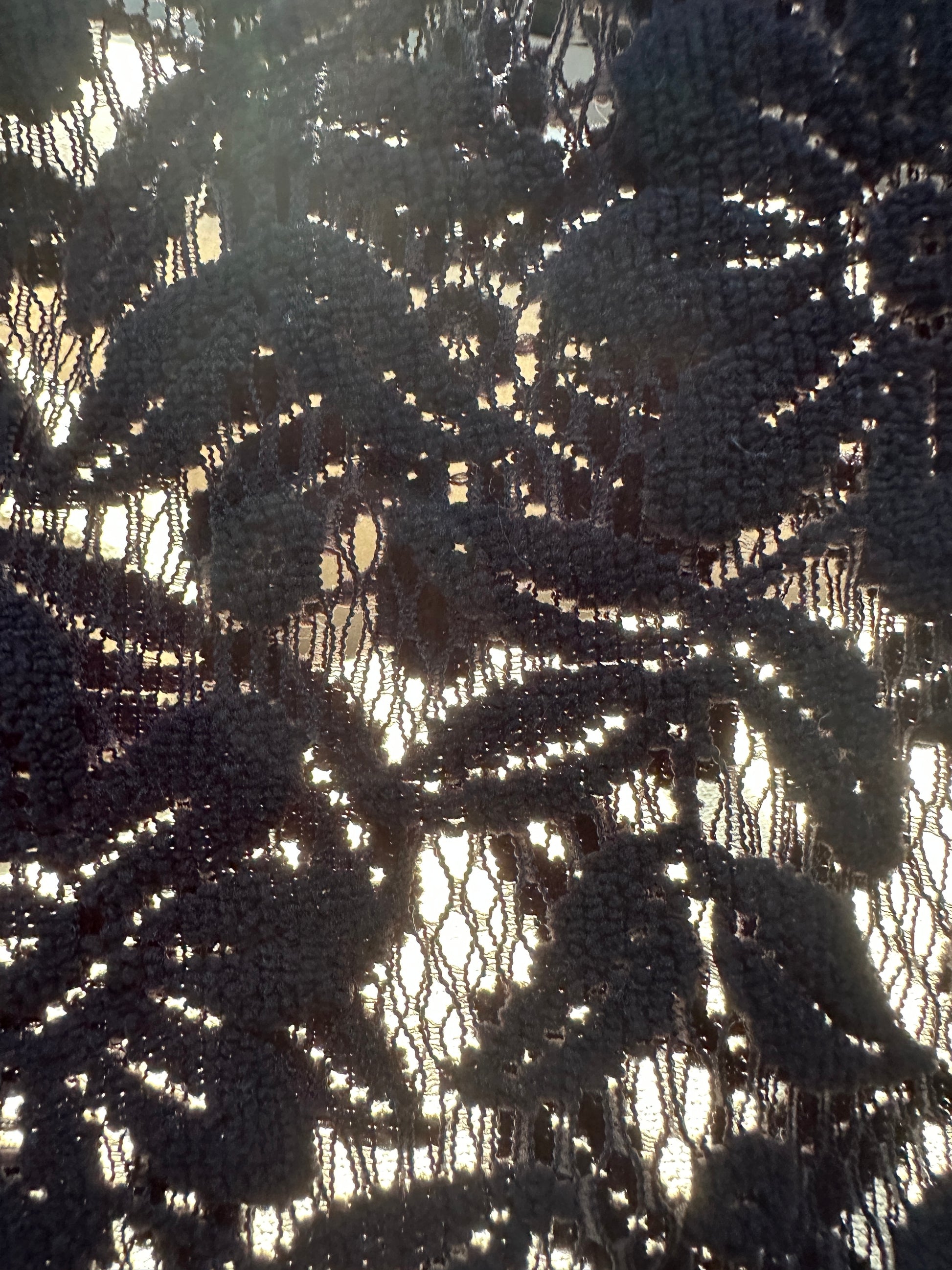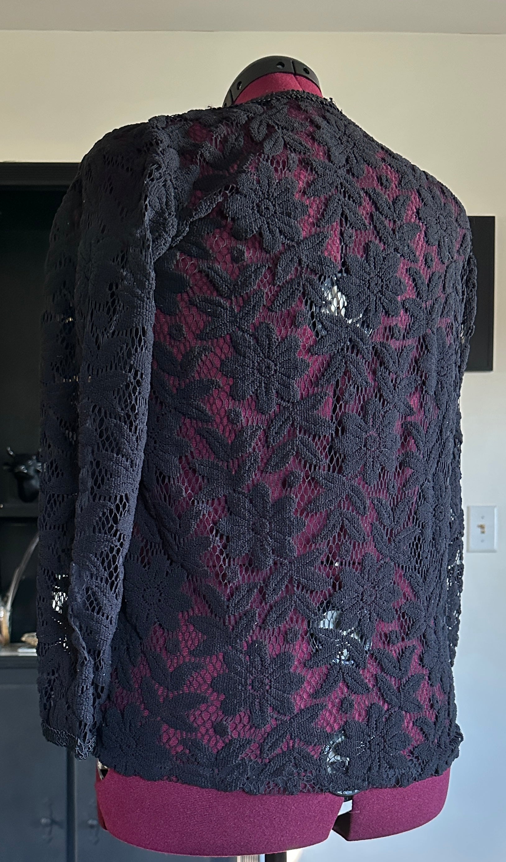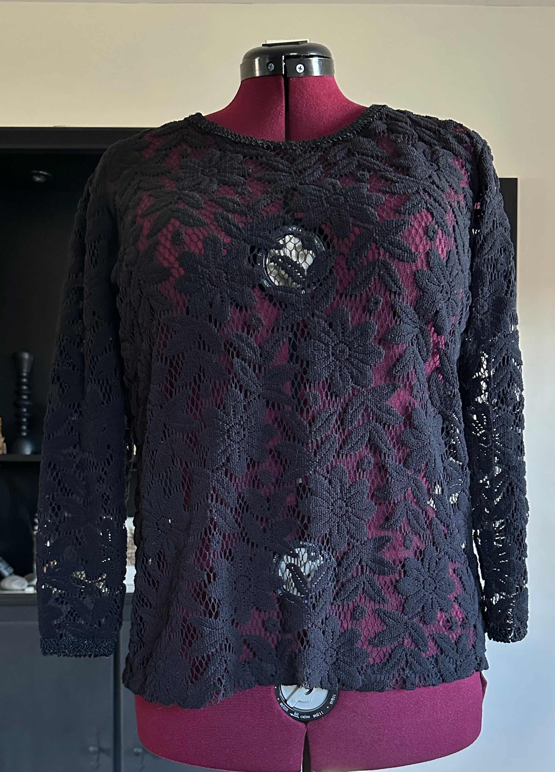 Sheer black floral lace pull-on top. Crew neck. Long sleeve. No tags. Most likely polyester blend. Some pilling but otherwise great condition.