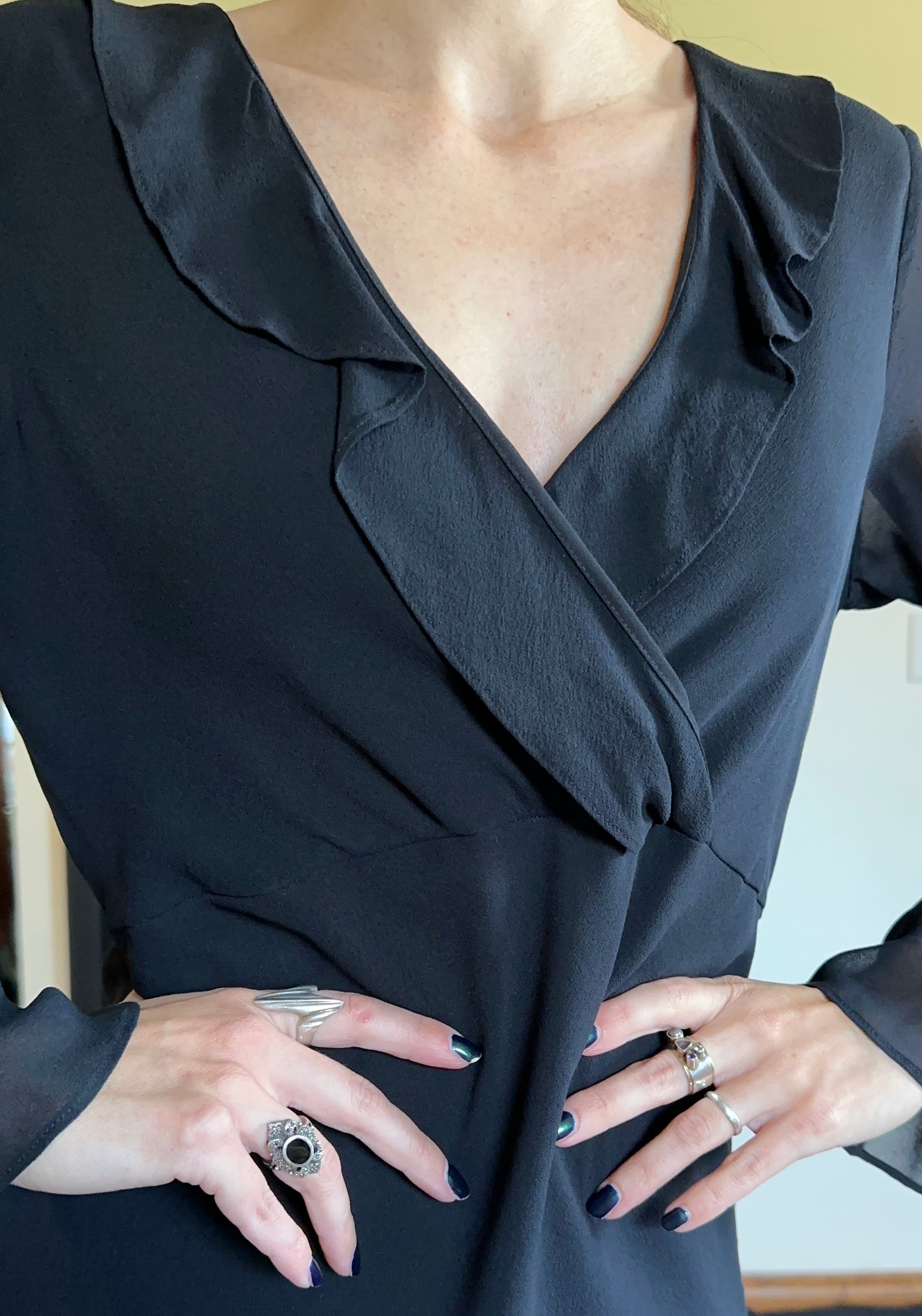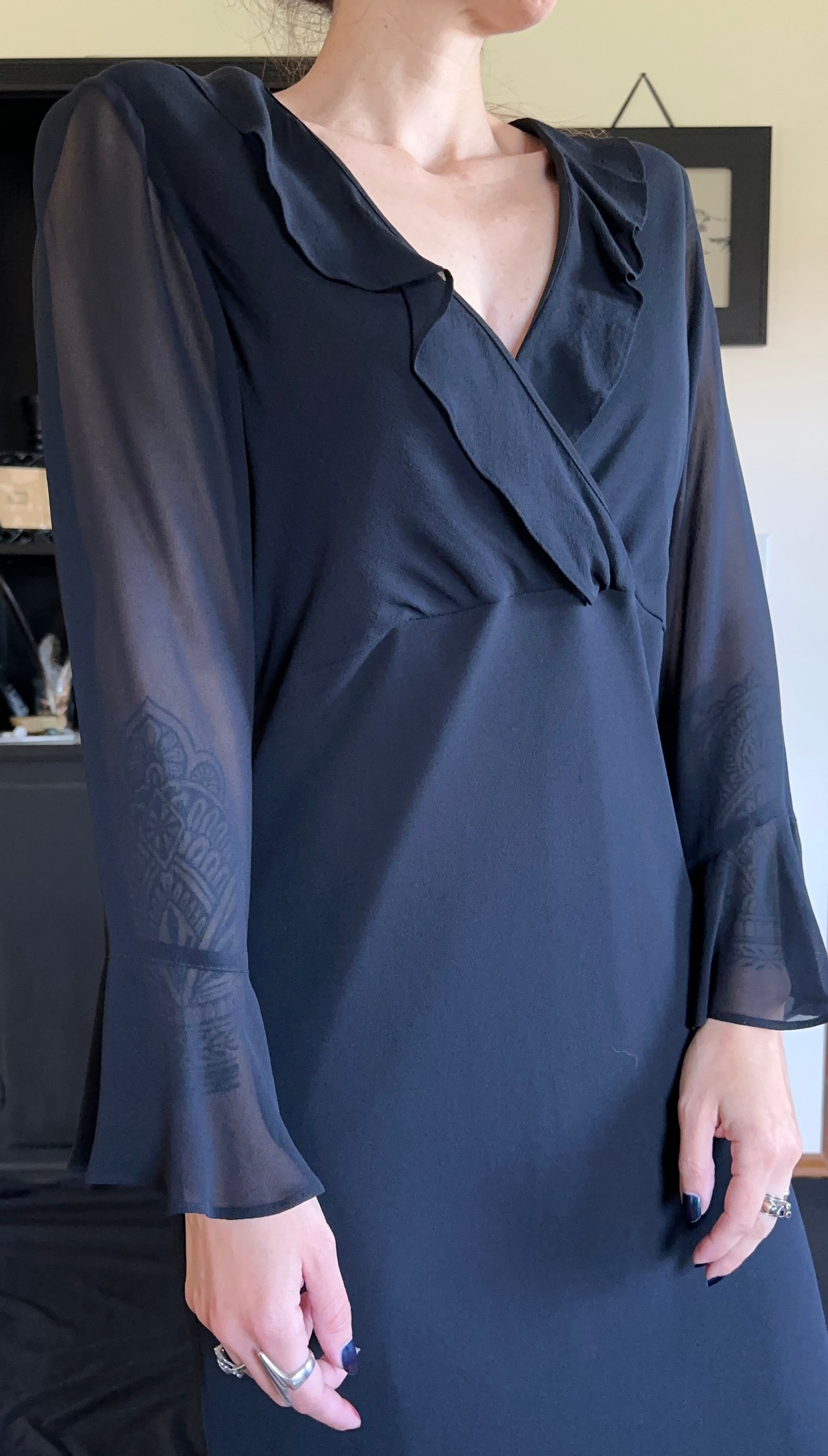 Vintage black silk chiffon bias cut midi dress. Ruffle at v-neckline and cuffs. Sheer sleeves. Seam under bust. No zippers - pull on. Fully lined. 100% silk.