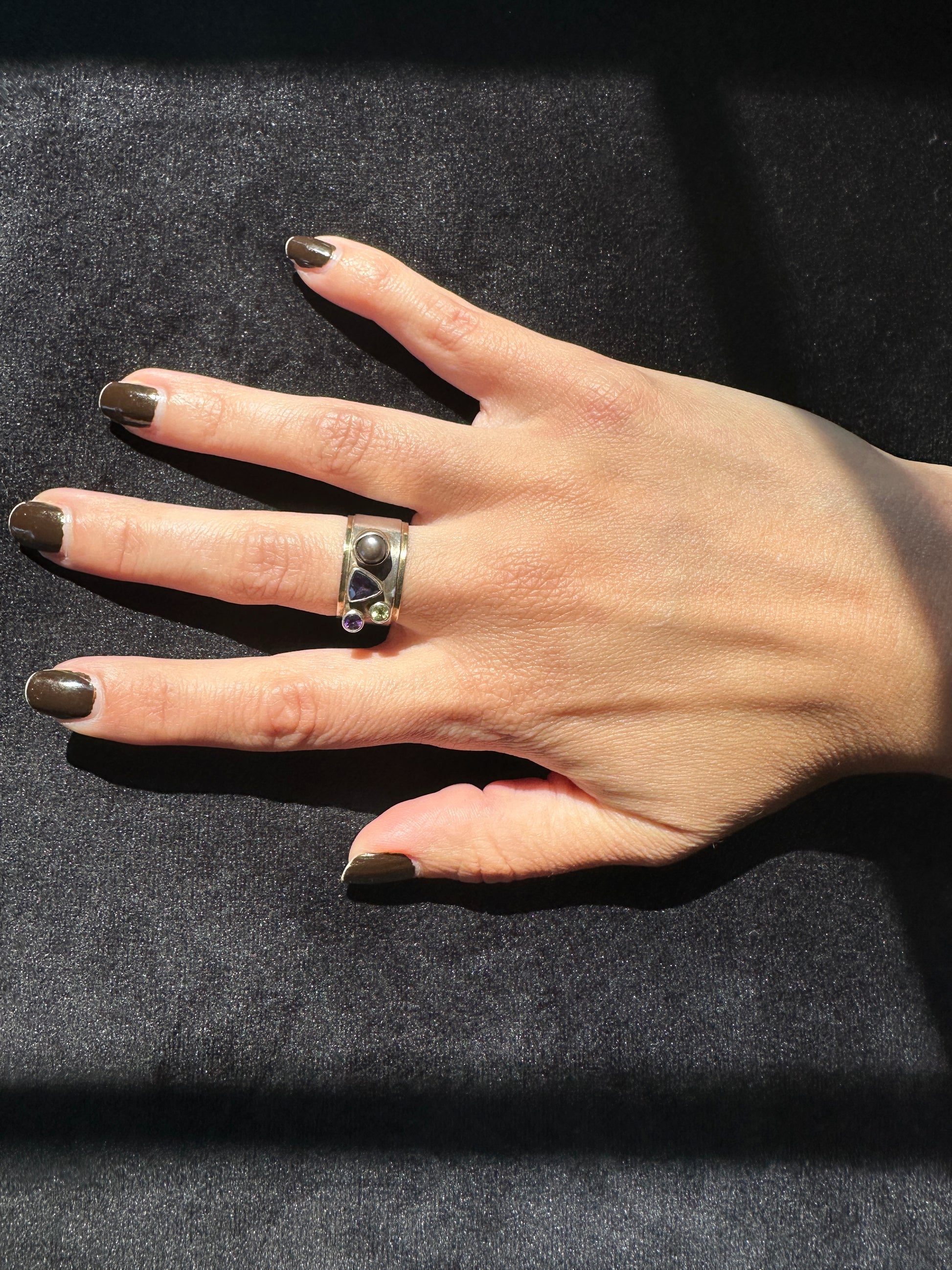 Silver black pearl, amethyst, & citrine ring with wide silver band.