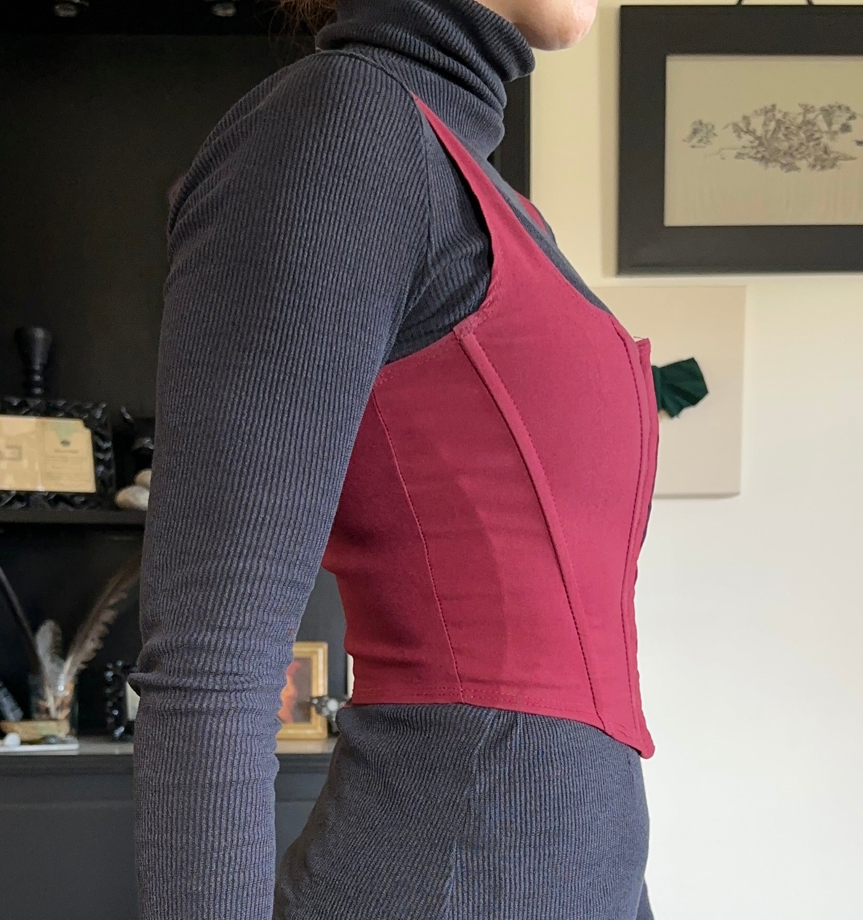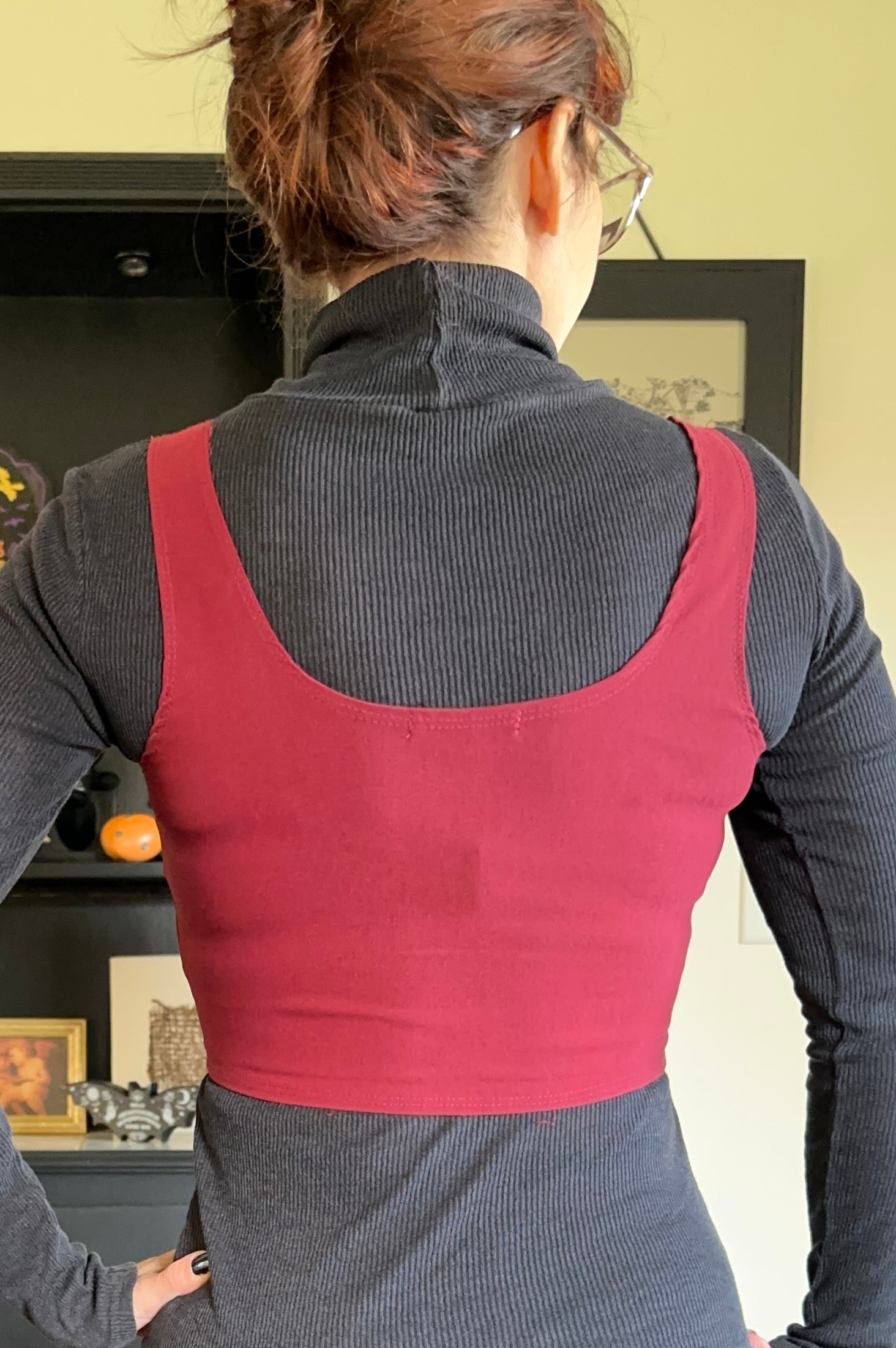 Secondhand red stretch corset. Opens at front with hook & eye closures. Rayon, nylon, spandex blend.