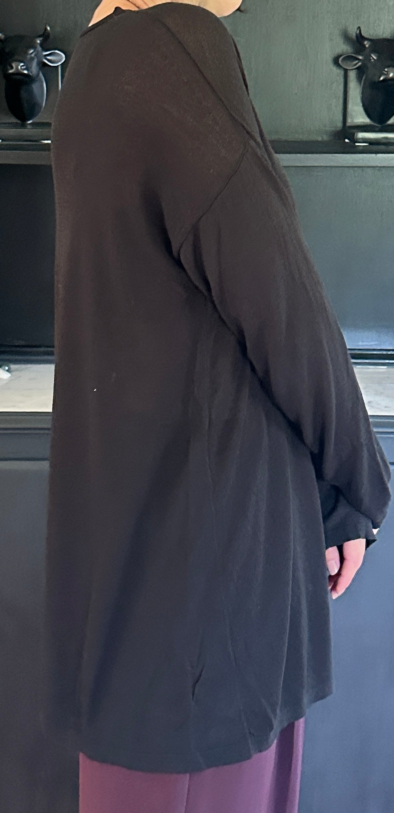 Secondhand black crewneck sheer tunic sweater made by Eileen Fisher. Tencel & Nylon.
