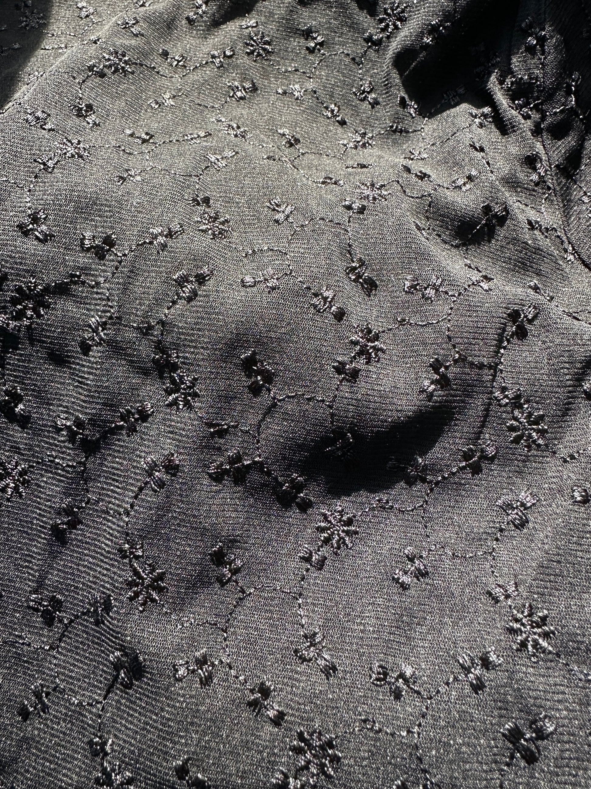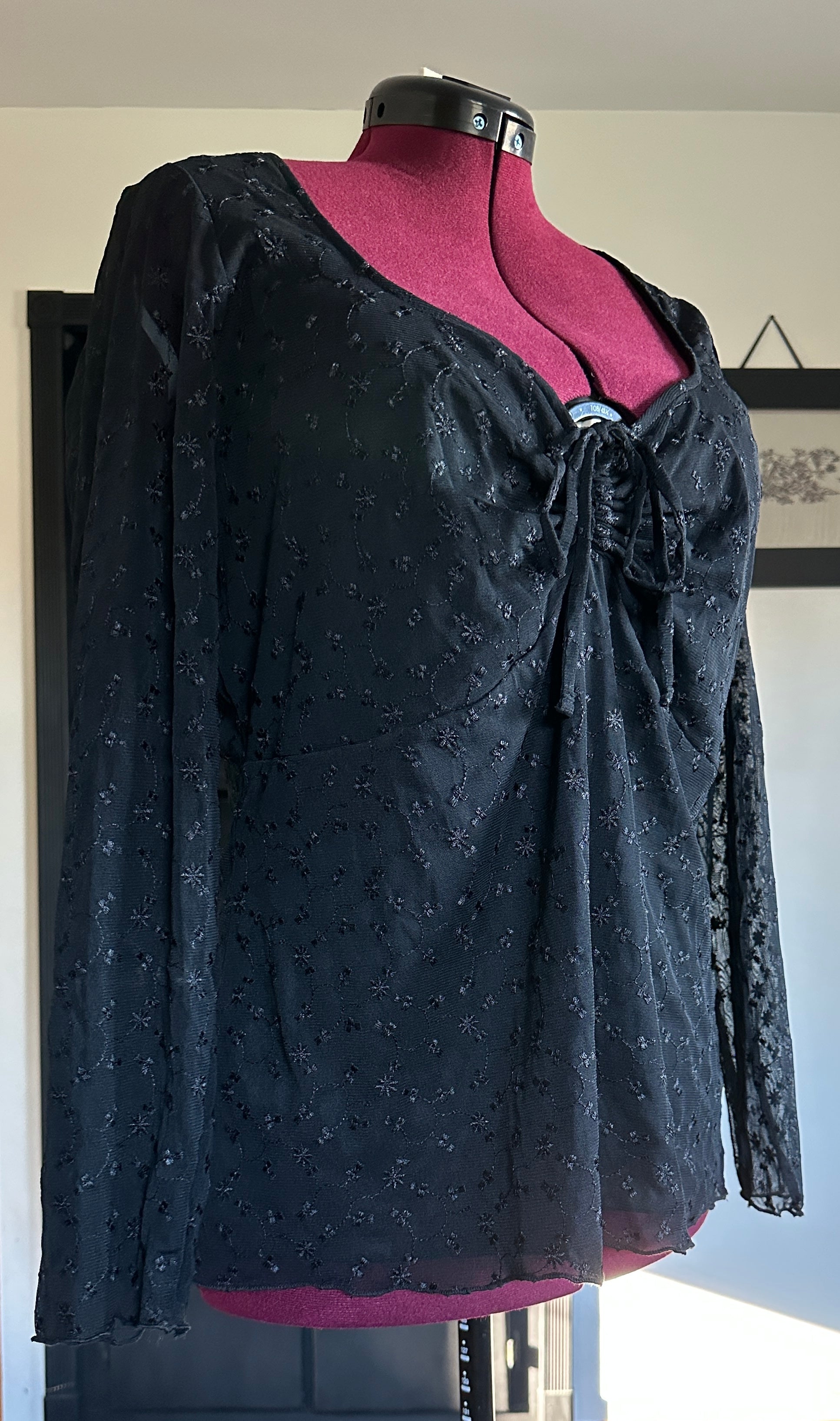 Secondhand Torrid black floral sheer sleeve top. Heart shape neckline. Functional drawstring pinch at bust to adjust neckline. Under bust seam. Sheer long sleeves. Nylon shell with polyester tank lining. Perfect condition.