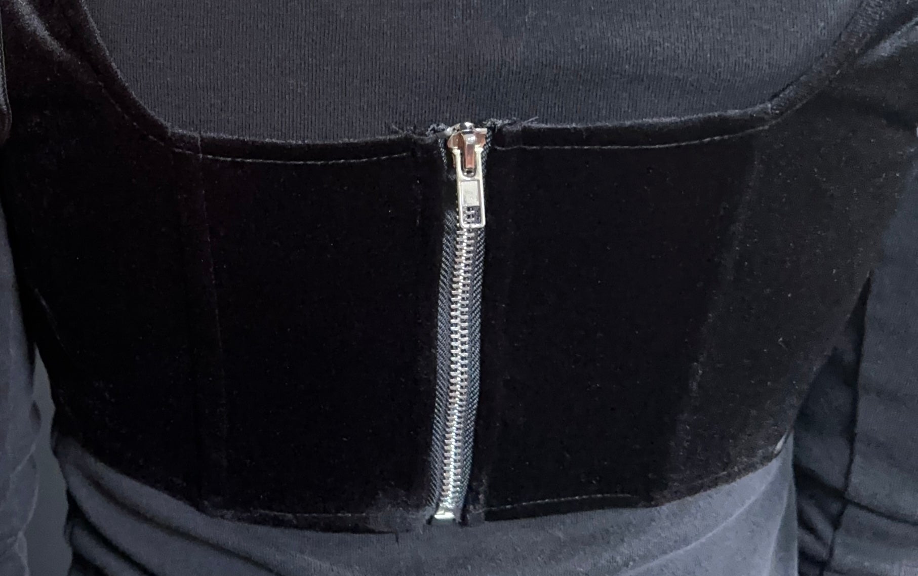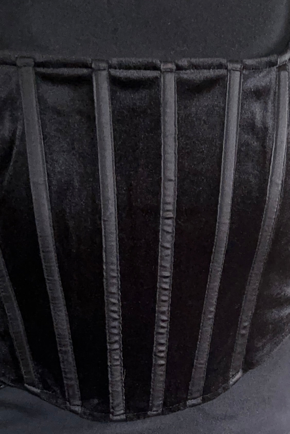 Secondhand black stretch velvet bodice top. Square neckline. Cropped length. Back zipper closure. Polyester elastane blend.