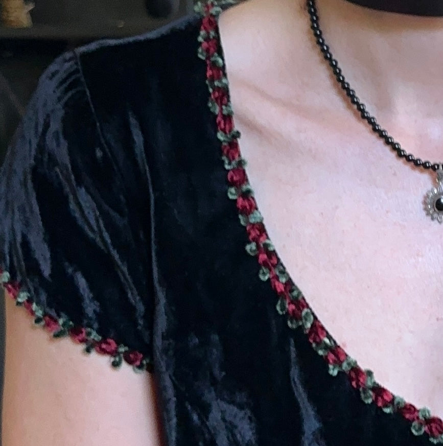 Vintage 90s Nanette Lepore black velvet dress. Cap sleeve with v-neckline. Rosebud detail on neckline and edge of sleeve. Back zip. Lined. 100% rayon.