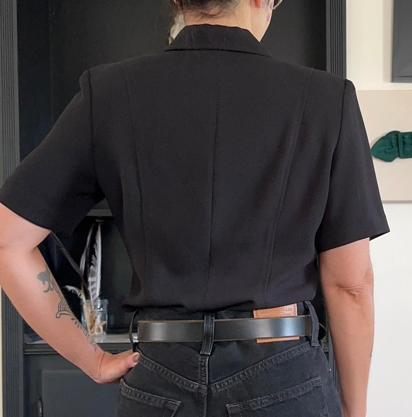 Vintage black button down blouse. Short sleeve. Polyester crepe.