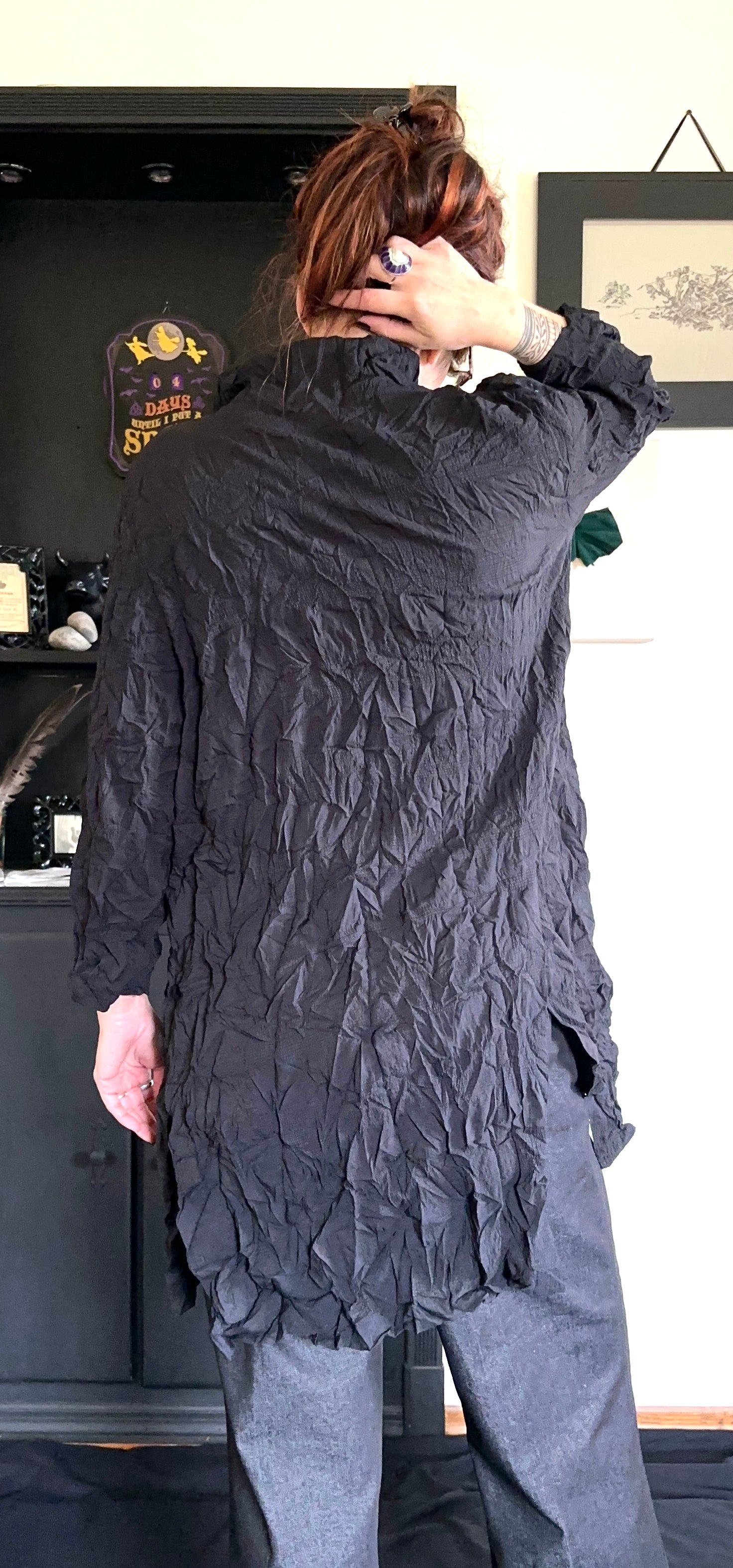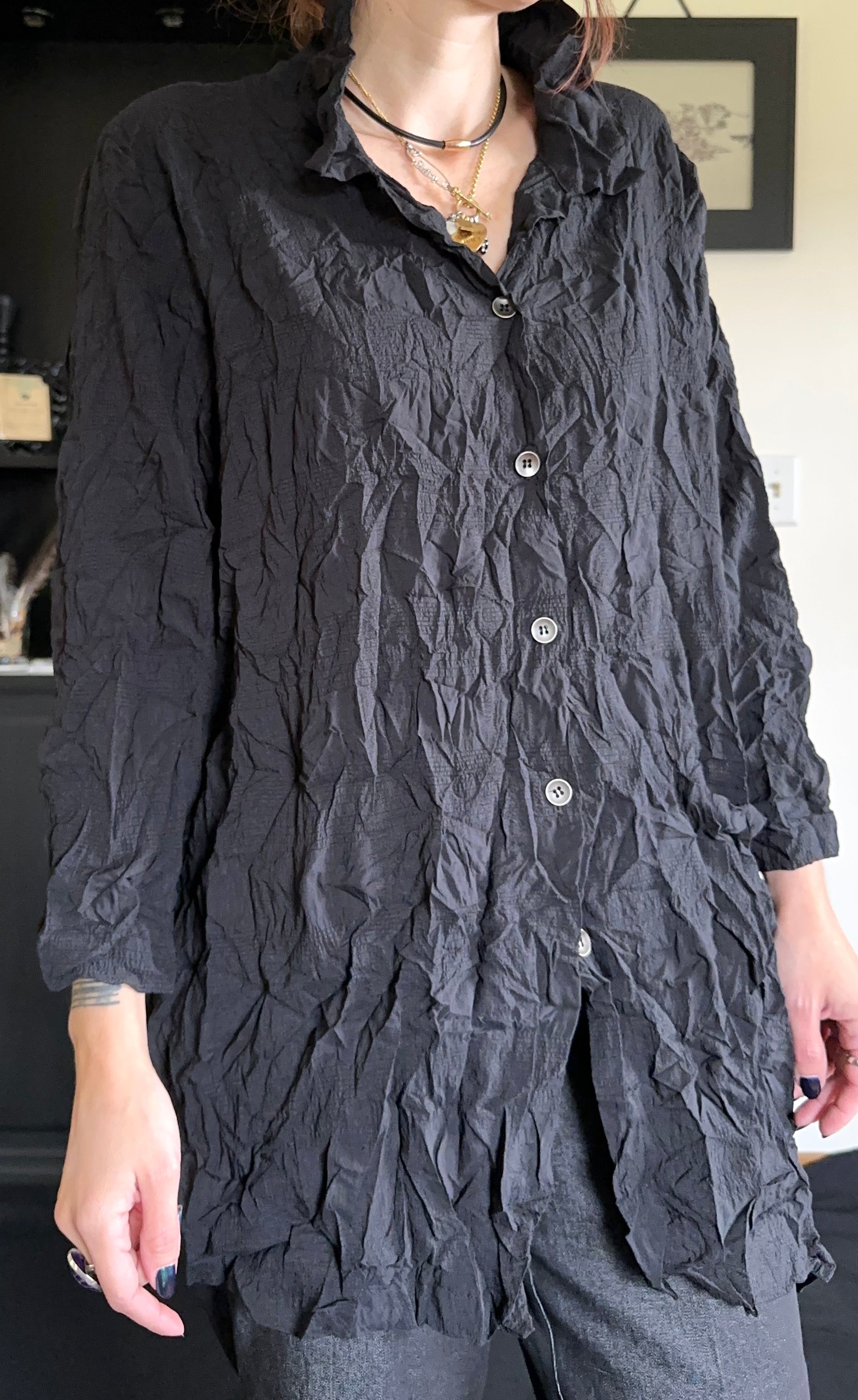 Vintage black crinkled button front shirt. Antiqued silver buttons. Single front patch pocket at hip. Asymmetrical hem. Polyester spandex blend.