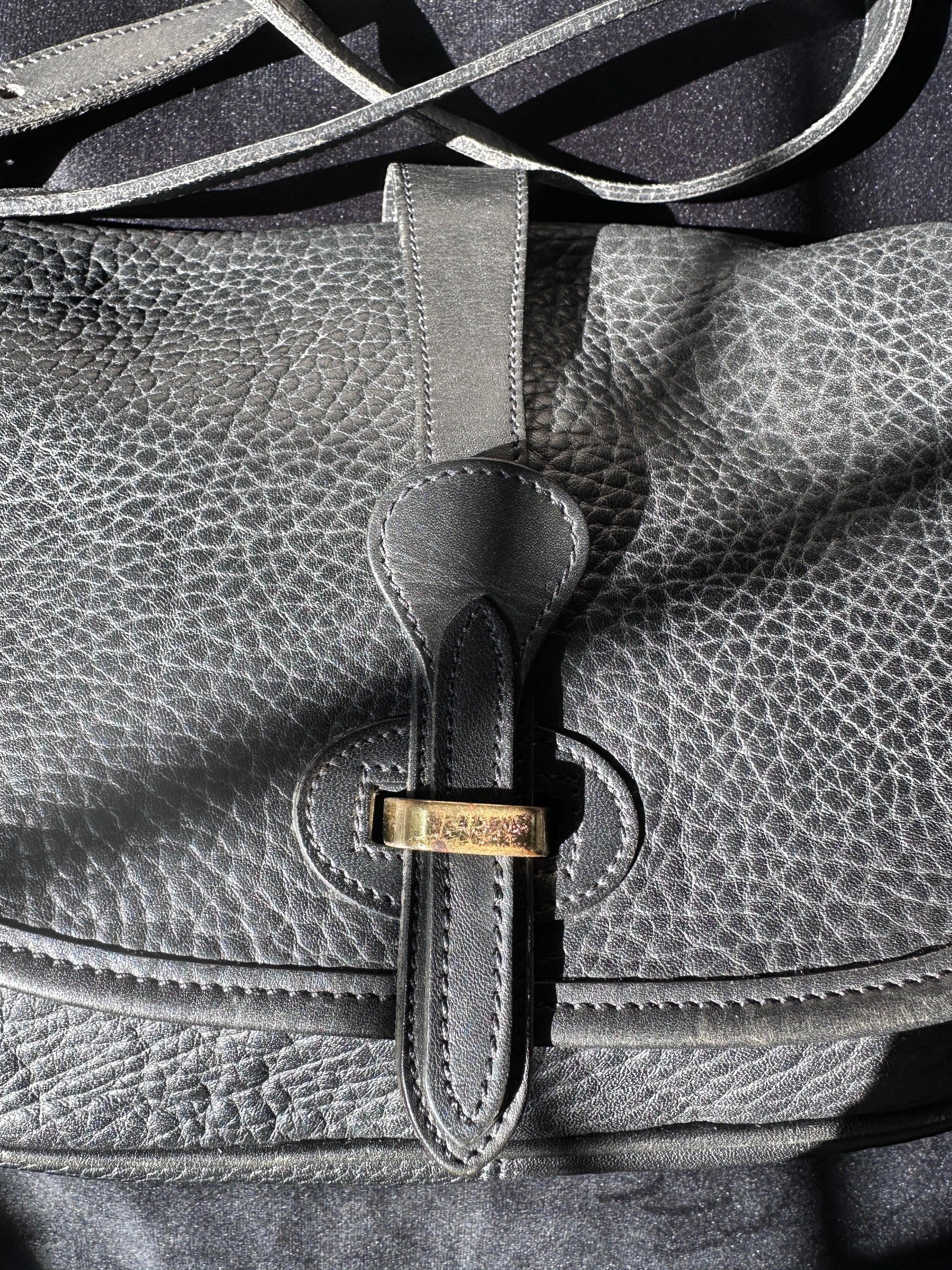 Some signs of use. Distressing on bottom edge of bag. Interior pocket zipper is stiff. Interior label cut. Leather is soft and supple - no cracking or peeling.