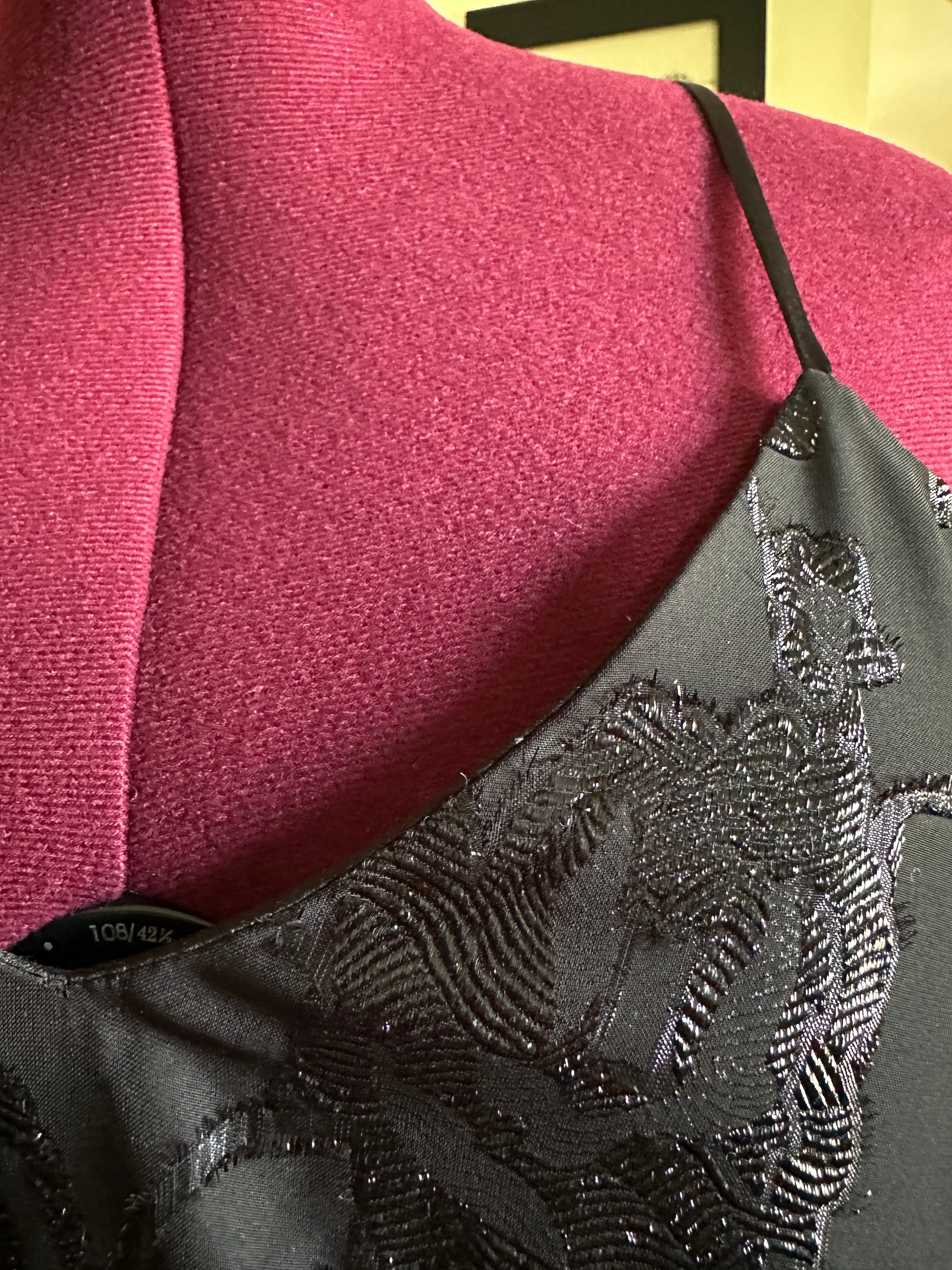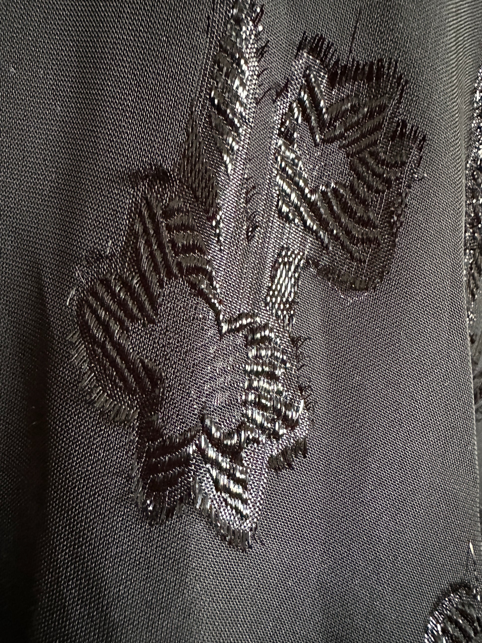 Vintage LAUNDRY swing dress with halter neckline. Black chiffon with metallic black floral accents. Adjustable sateen straps. Fully lined with an interior shelf bra. 100% polyester. Excellent condition.
