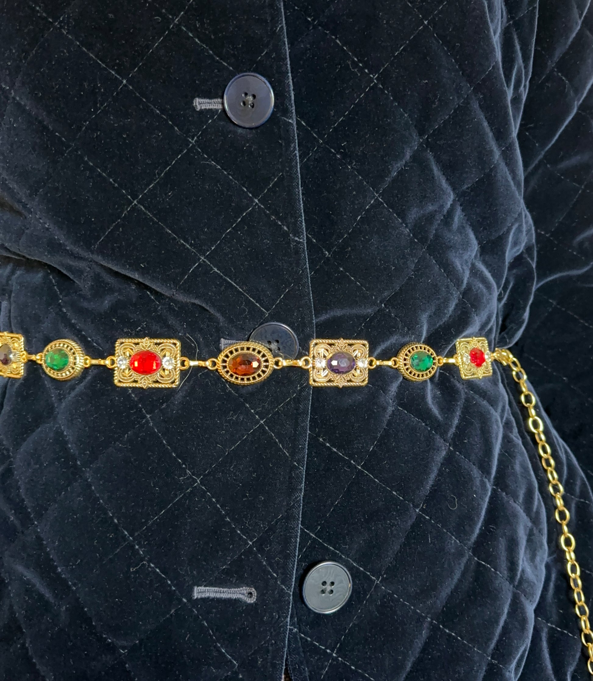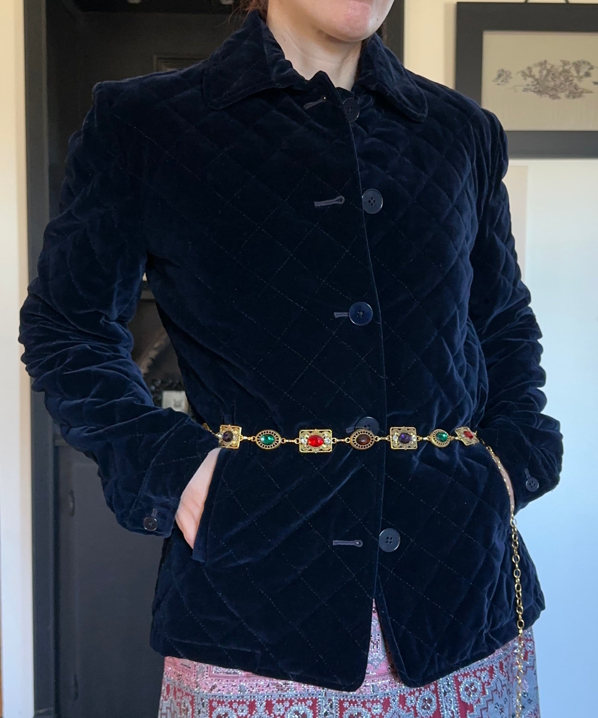 Vintage midnight blue quilted velvet blazer. Button front. Side slash pockets. Single button at cuff. Straight cut. 98% cotton 2% elastane.