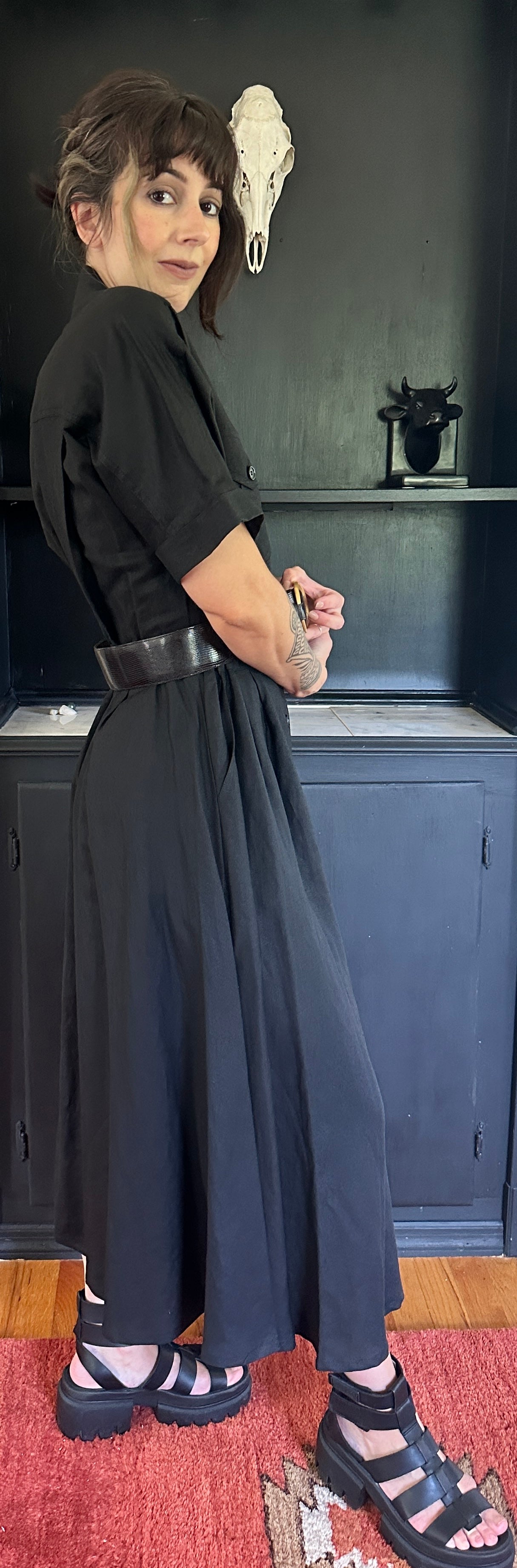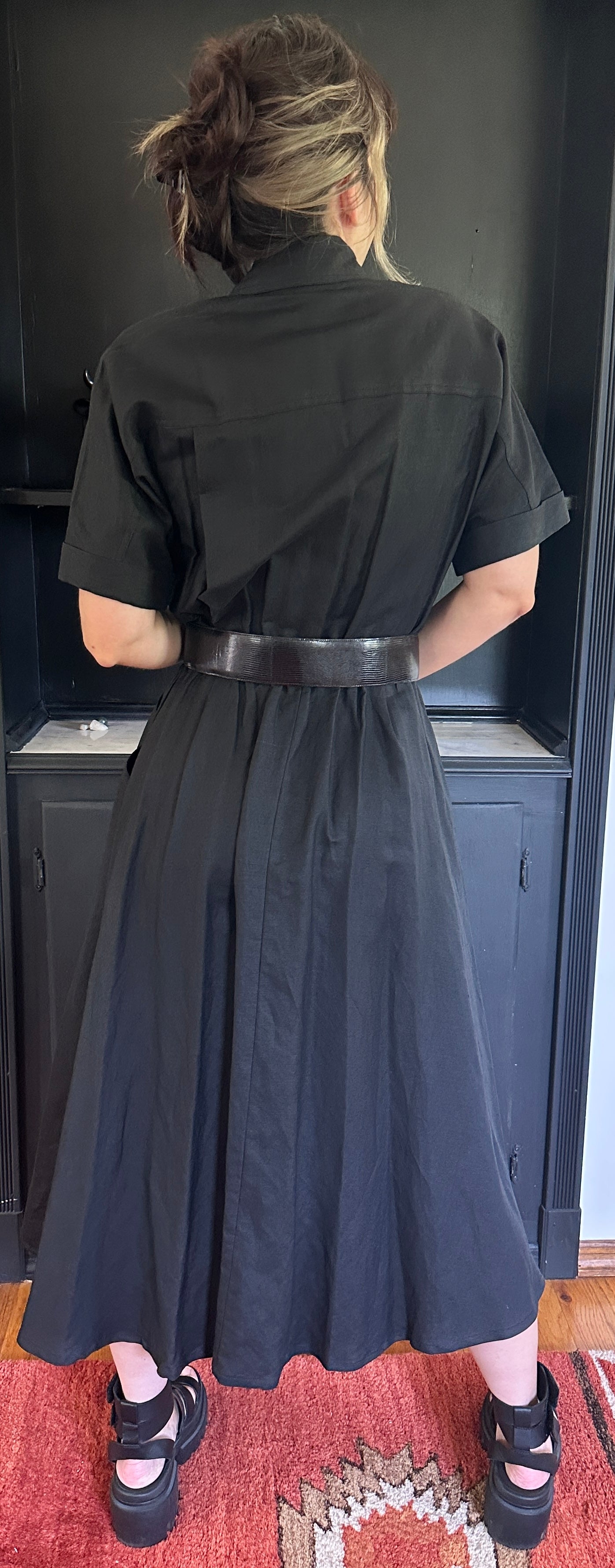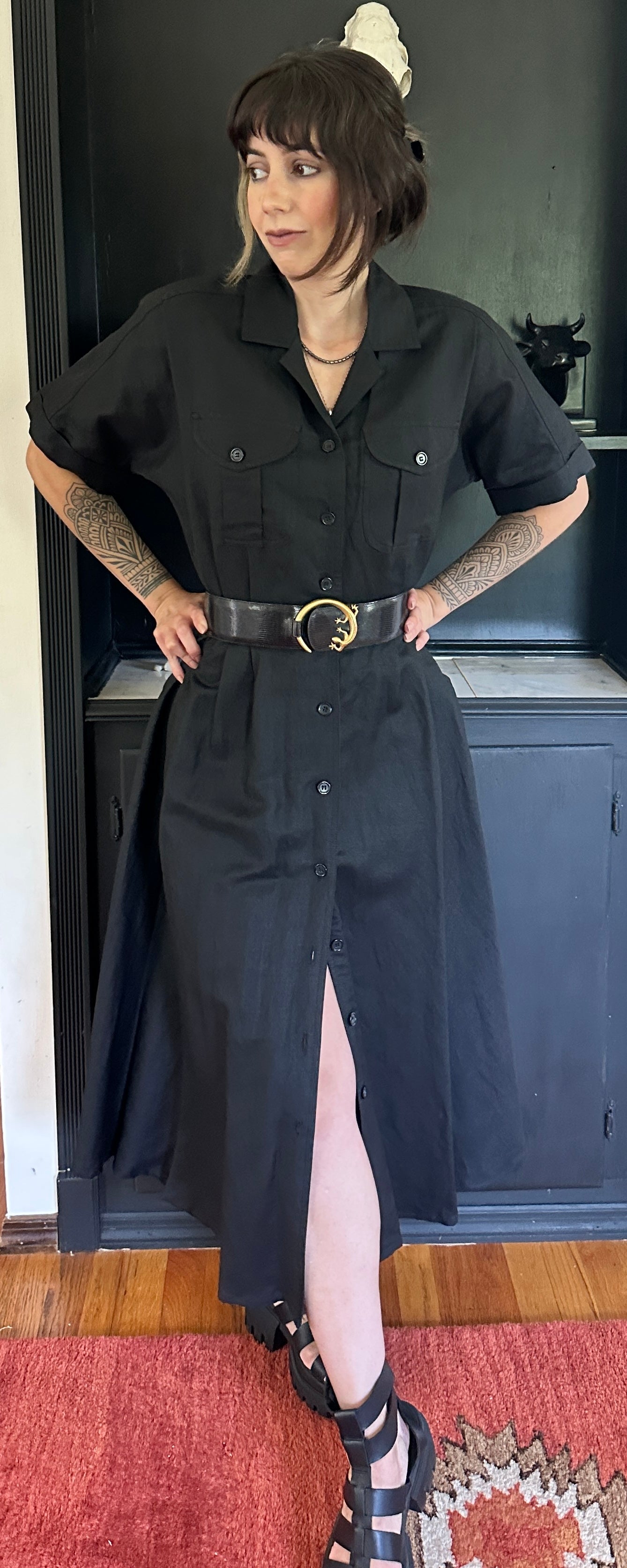 Vintage 80s black short sleeve safari dress. Button front. Breast pockets. Elastic waist. Full skirt. Made by Ellen Ashley. Rayon and Linen blend.
