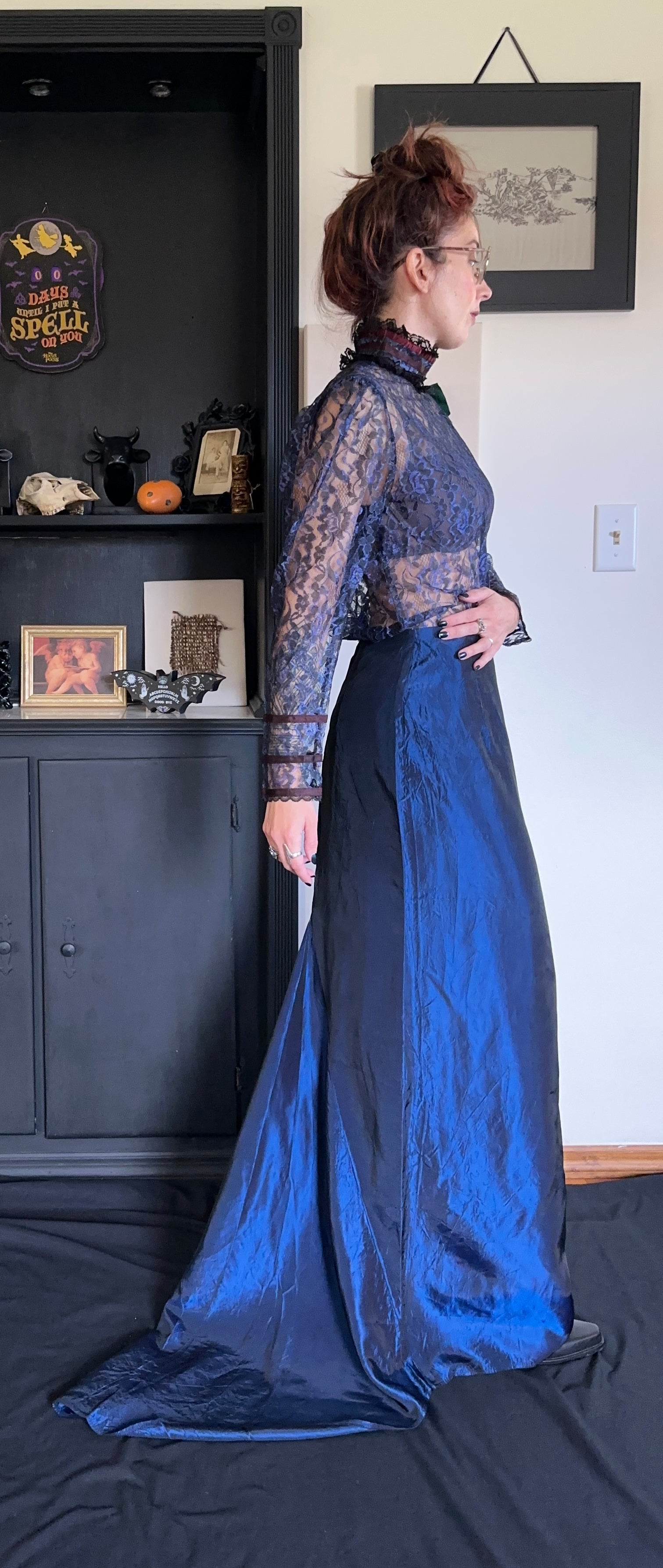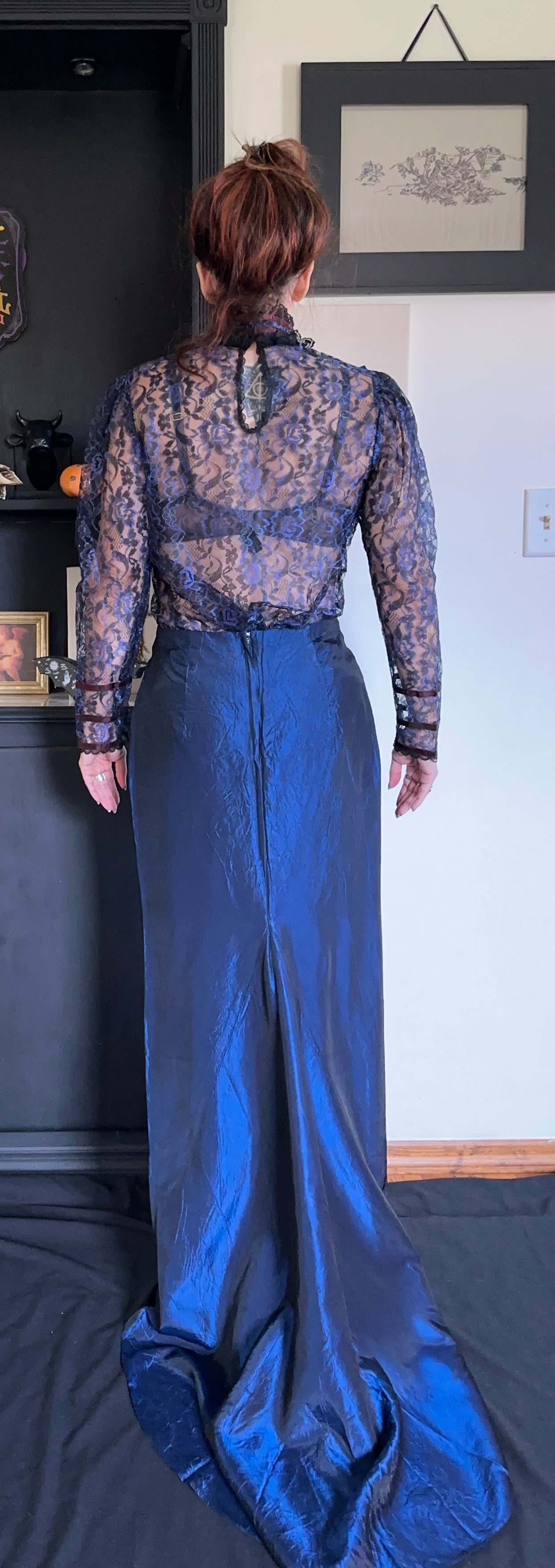 Vintage 90s deep blue full length skirt with train. Back zipper with hook & eye. Lined. 100% acetate. AS IS.