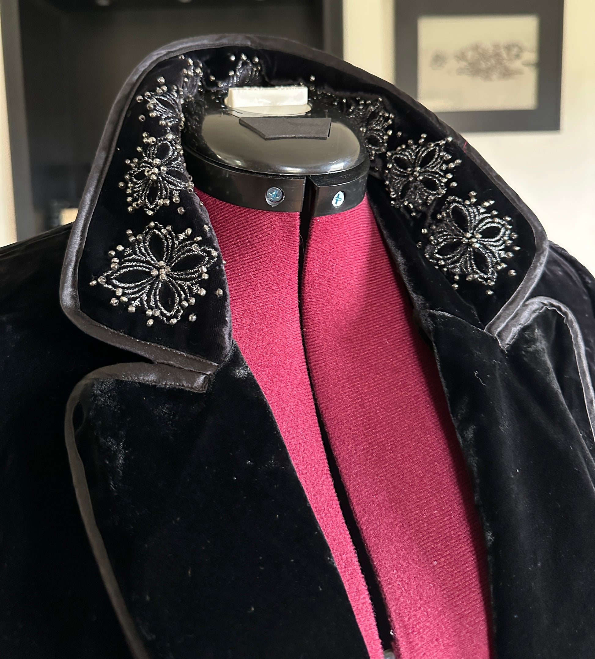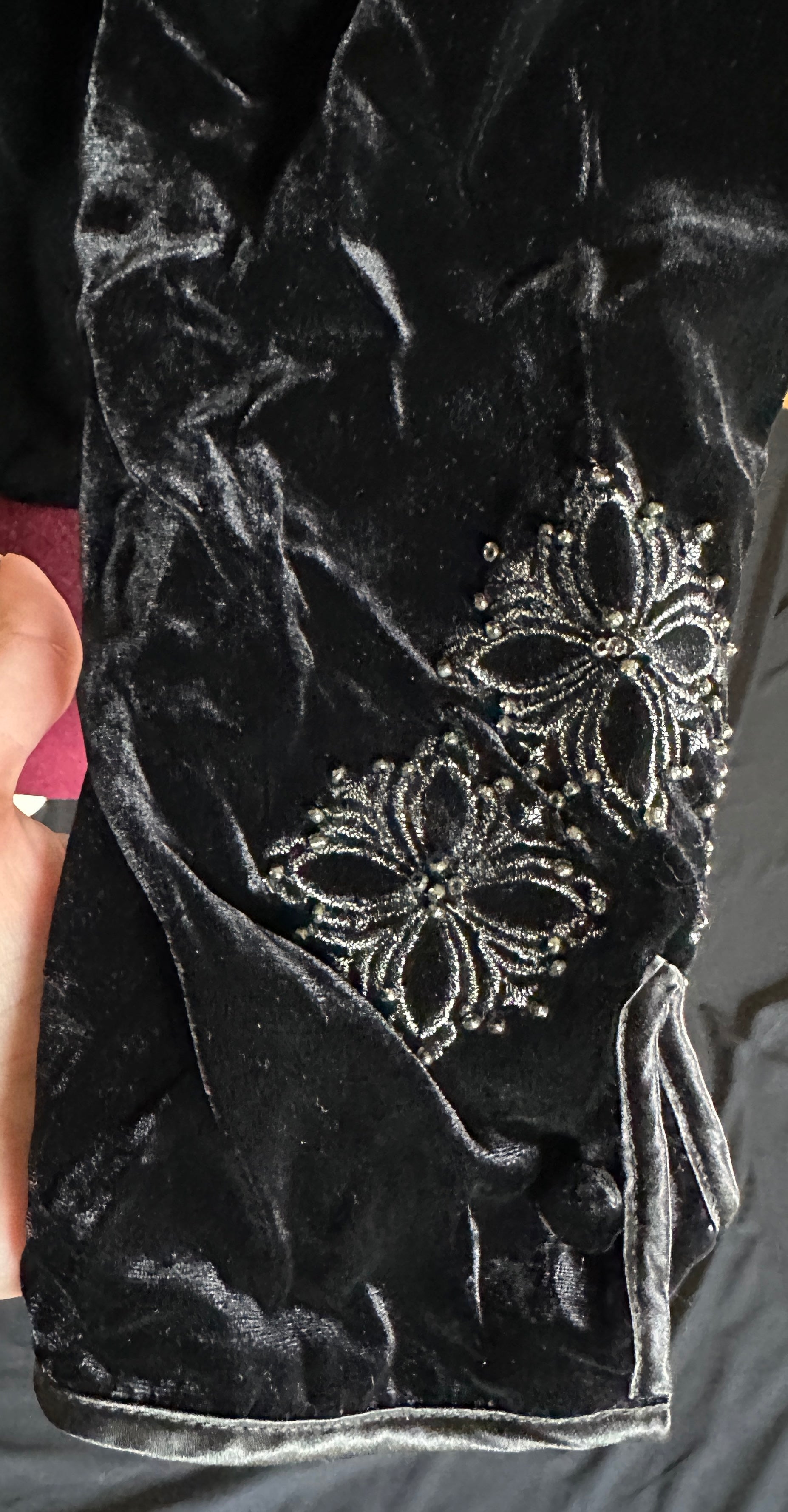 Vintage black velvet blazer with beaded accents. Loose fit. Satin tie front. Satin trim on collar and cuffs. Rayon silk blend.