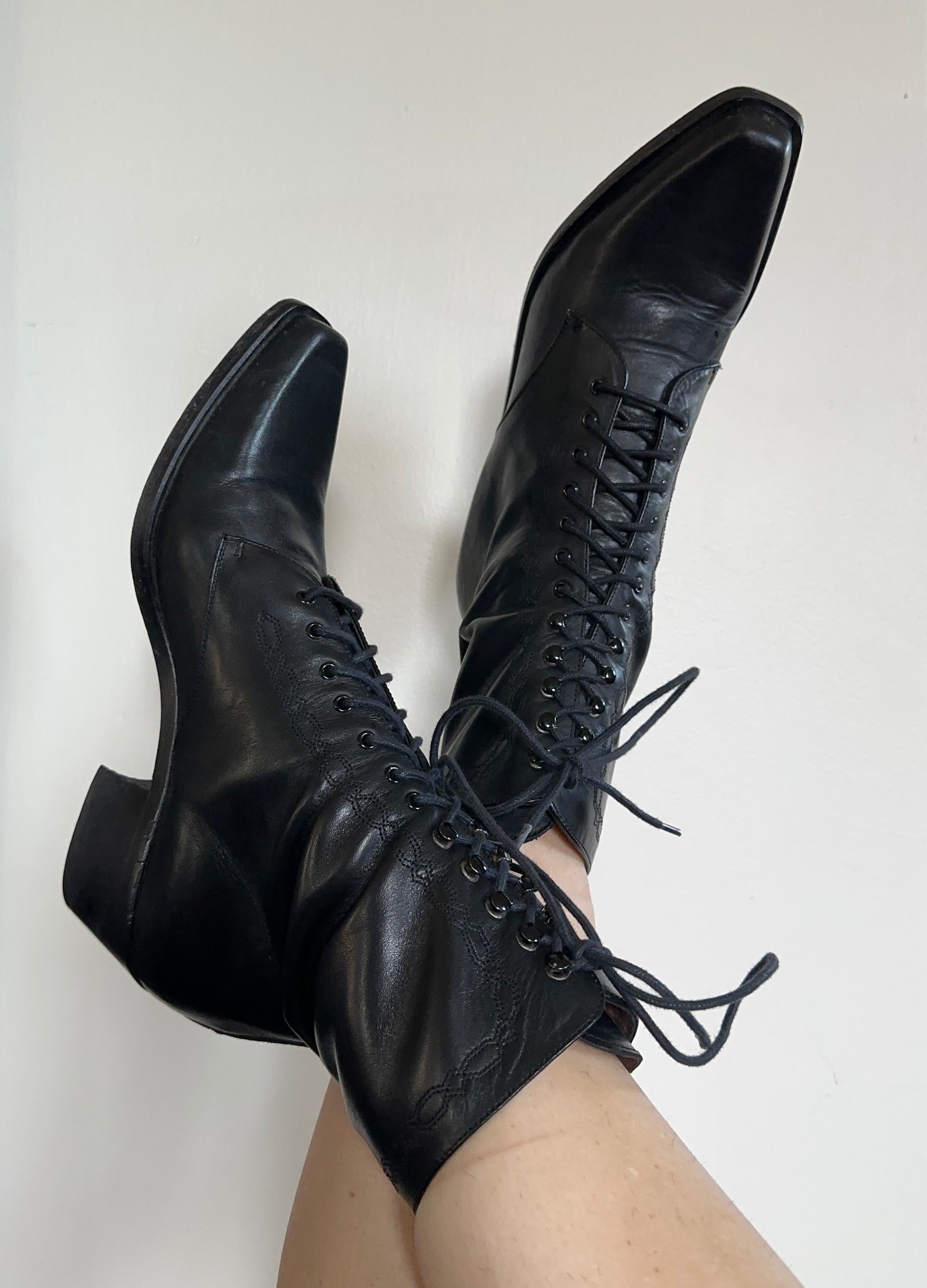 Vintage black leather Victorian revival lace-up boots. Original leather sole with stacked heel. 100% leather.
